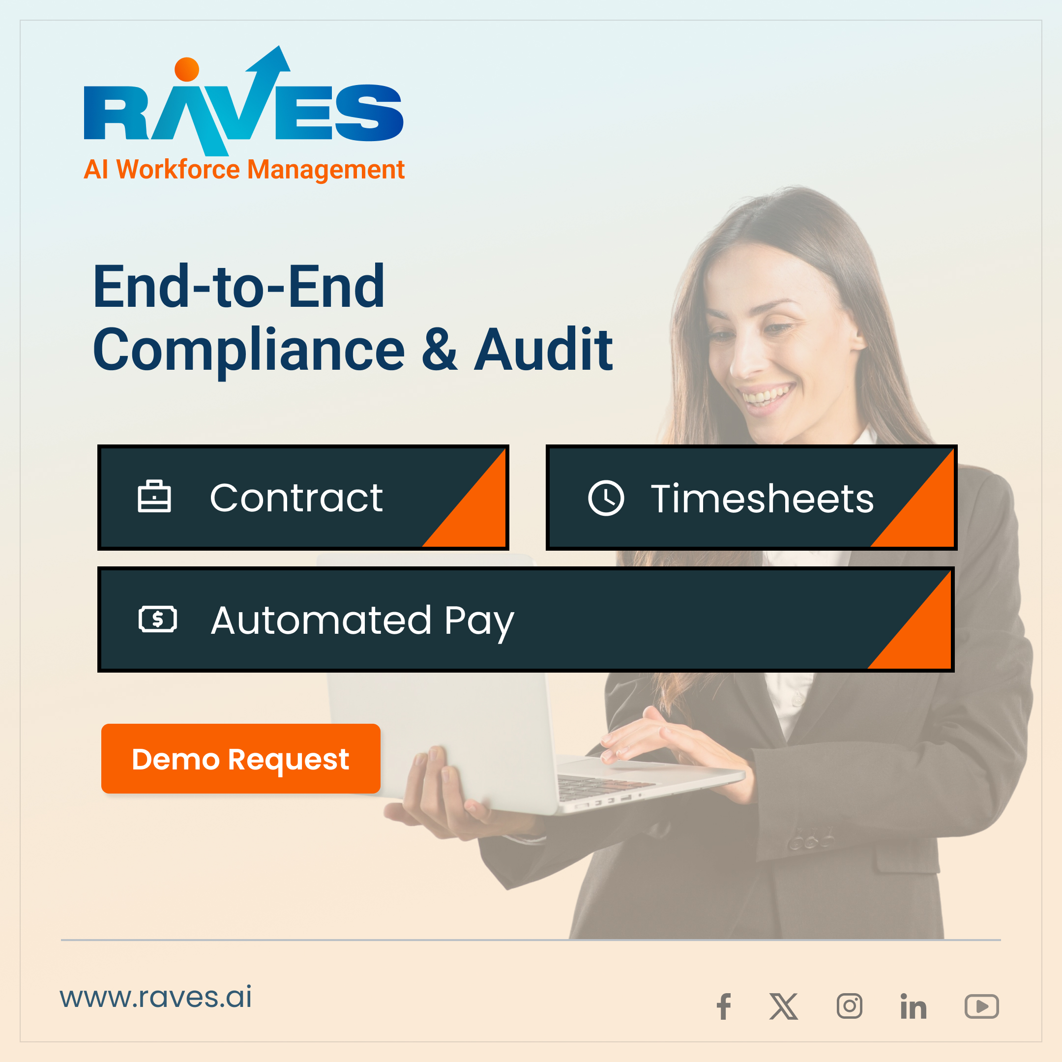 RAVES simplifies workforce operations with end-to-end compliance and audit visibility — from Contracts to Timesheets to Automated Payments.
