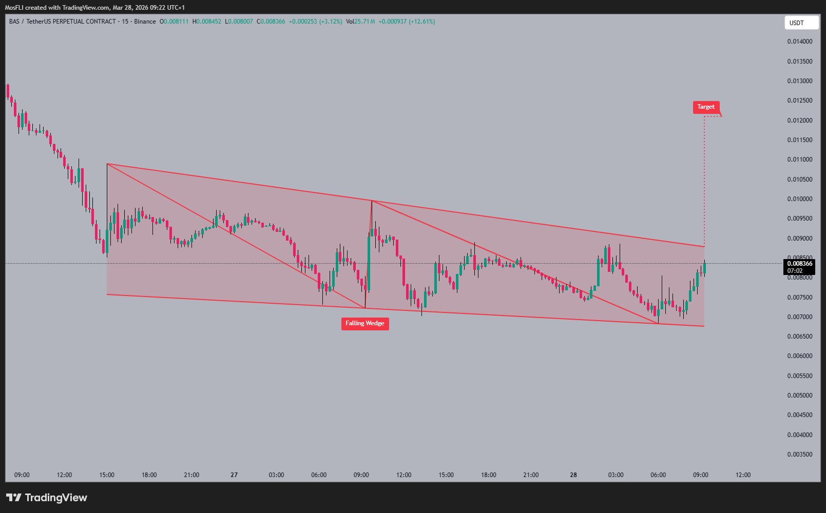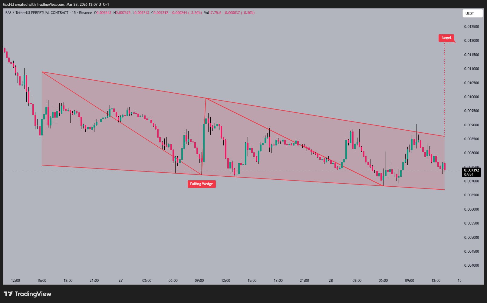 #BAS is currently trading around 0.007392 📉 after bouncing off the lower trendline. A falling wedge pattern has formed 📐 which typically indicates a potential bullish reversal. The next target for #BAS is around the 0.012000 level 🎯 if the wedge breaks upwards.