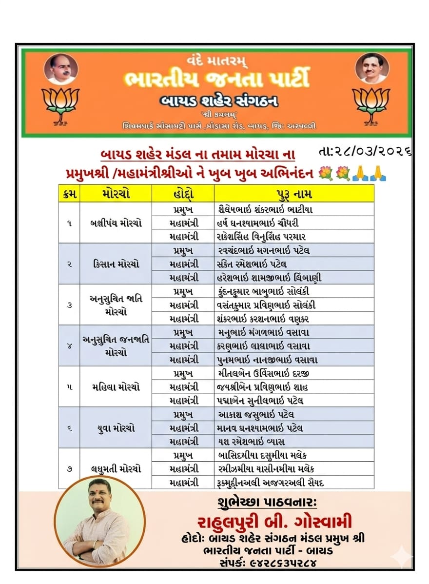 ભારતીય જનતા પાર્ટી બાયડ શહેર મંડળના તમામ મોરચાના નવનિયુક્ત પ્રમુખ/મહામંત્રી શ્રીઓને ખૂબ ખૂબ અભિનંદન પાઠવું છું.