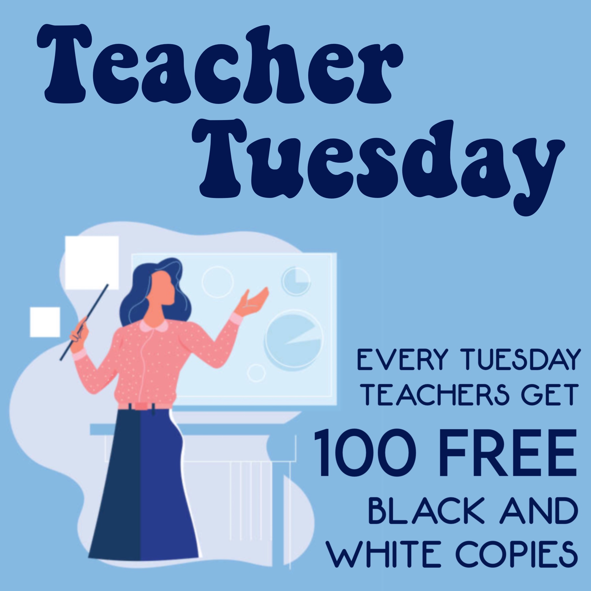 Allow us to show our appreciation with our weekly special. TEACHER TUESDAY is designed to show some love for those that are shaping the minds of the future. Come in today to receive 100 free black and white copies EVERY TUESDAY!