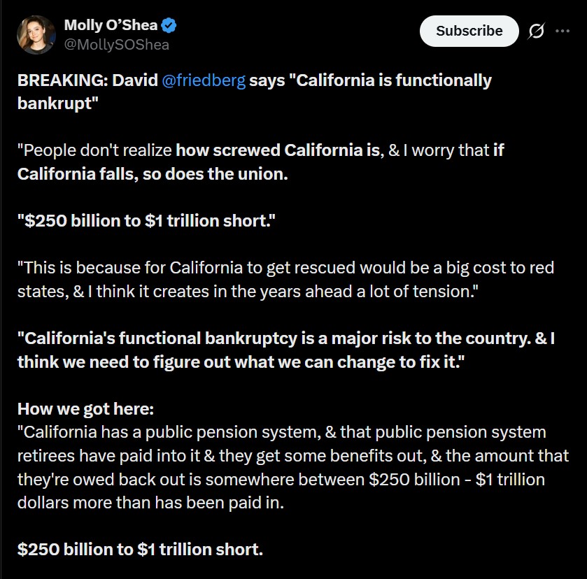 BREAKING: David @friedberg says "California is functionally bankrupt"