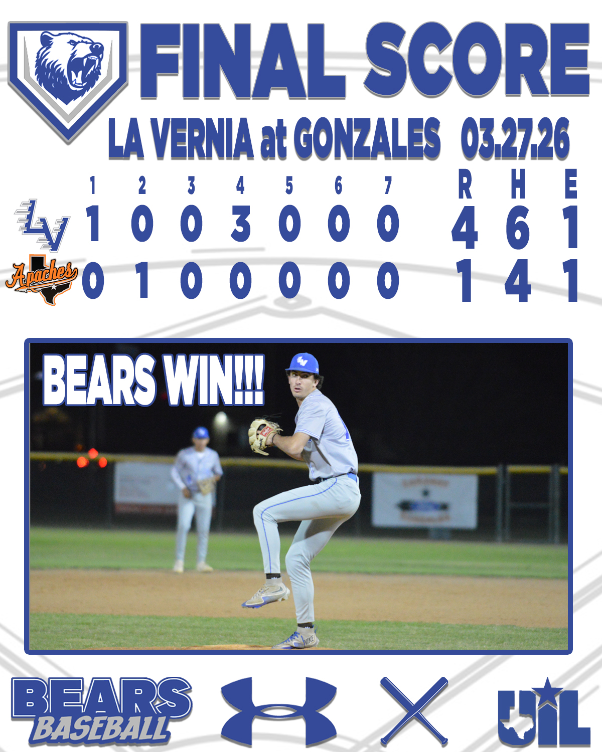 Bears go down in order in the top of the 5th. 9-1-2 due up for the Apaches in the home half of the inning.