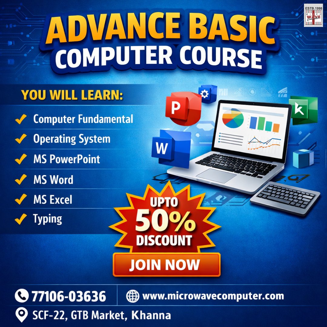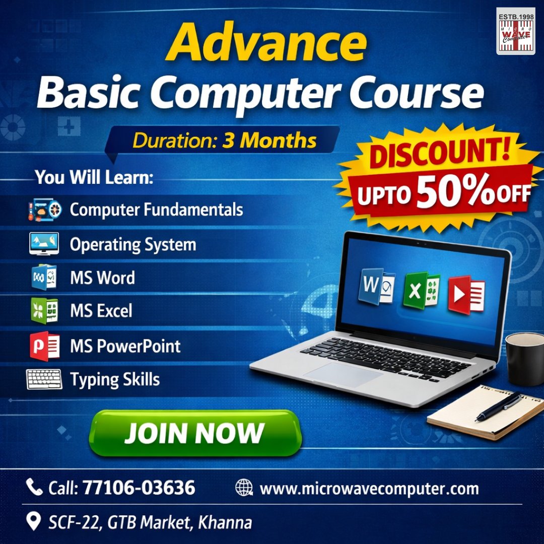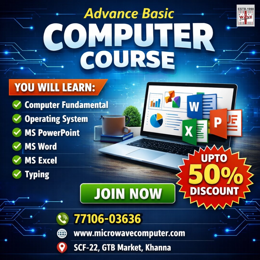 Join Micro Wave Computer Institute, the best computer training institute in Khanna, offering affordable and ISO-certified basic computer courses with practical learning.
