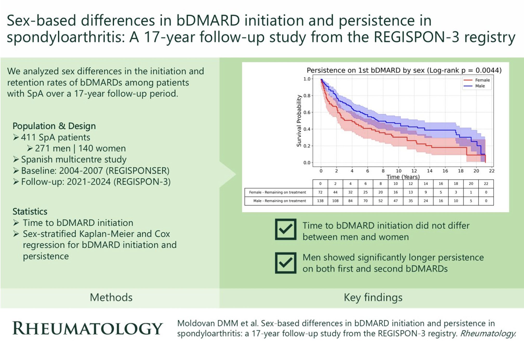 *Moldovan DMM, Ladehesa-Pineda L, Puche-Larrubia MÁ et al. Sex-based differences in bDMARD initiation and persistence in spondyloarthritis: a 17-year follow-up study from the REGISPON-3 registry. Rheumatology (Oxford). Published online March 21, 2026.