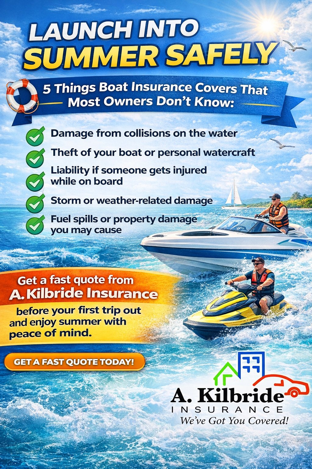 Watercraft Insurance helps protect your boat or jet skis from accidents, damage, and liability out on the water 🌞⚓ So you can cruise the coast worry-free!