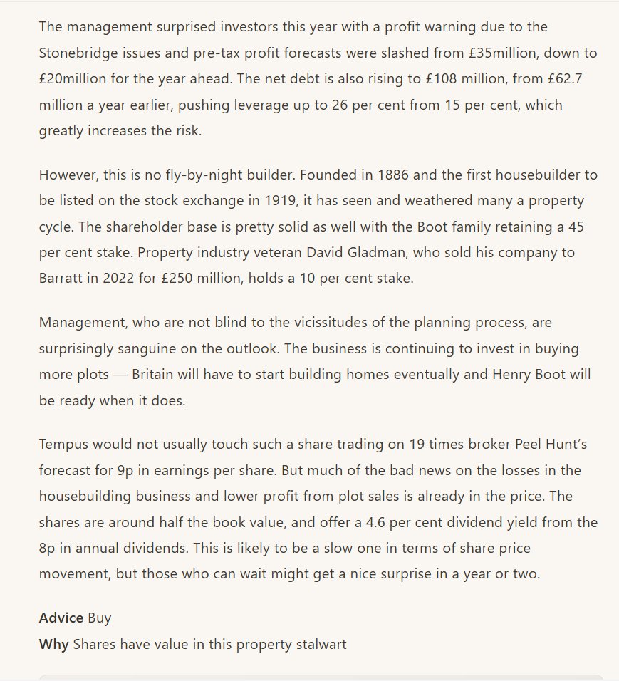 BUY #BOOT Henry Boot Says Tempus In The Times Is it worth building a long-term stake in Henry Boot? The business is continuing to invest in buying more plots — Britain will have to start building homes eventually and this developer will be ready when it does