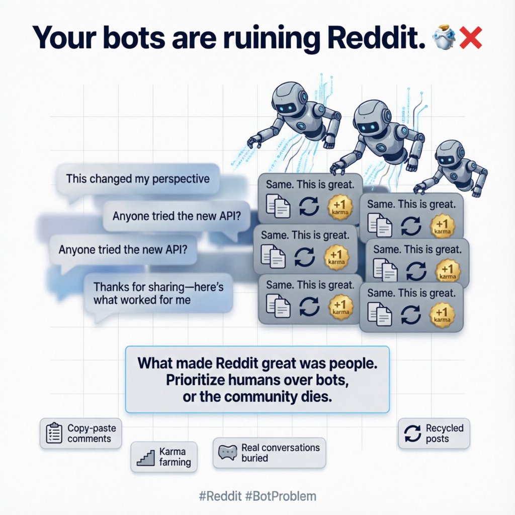 Copy-paste comments, recycled posts, karma farming—real conversations are getting buried under automated noise.
