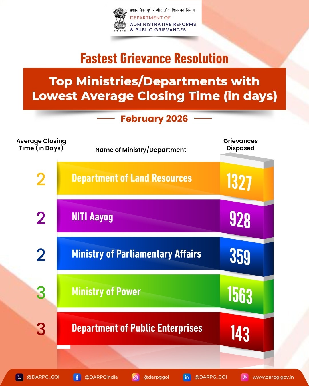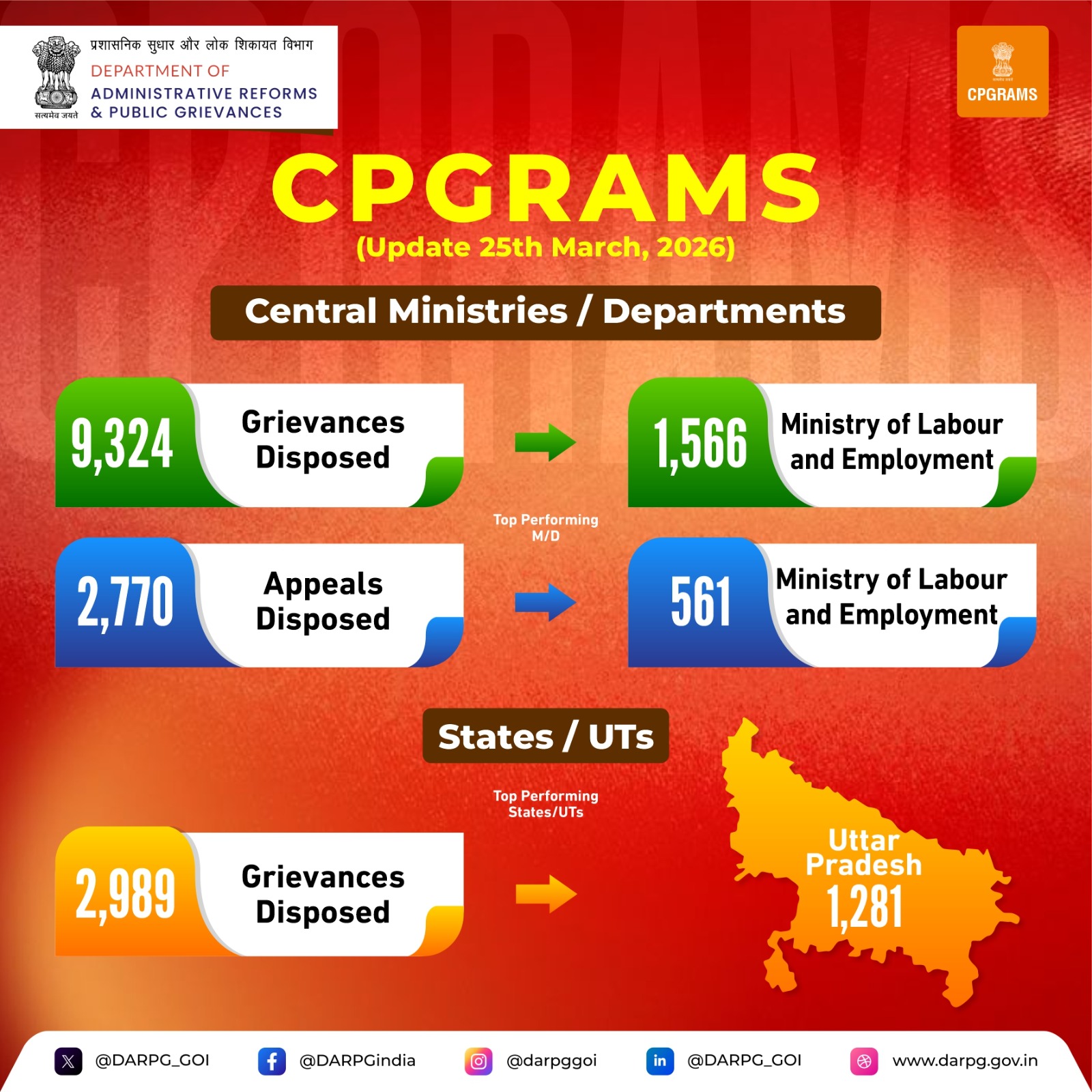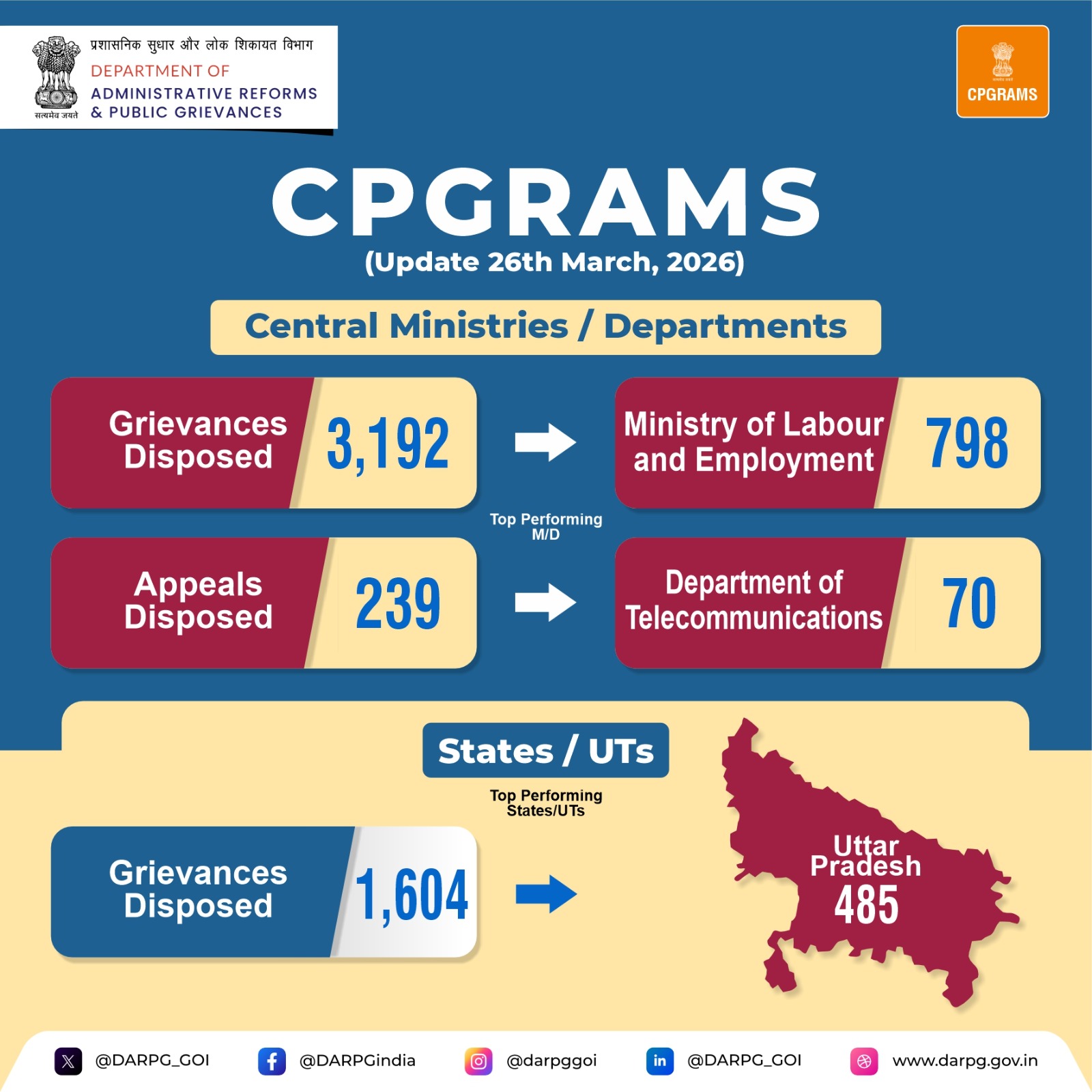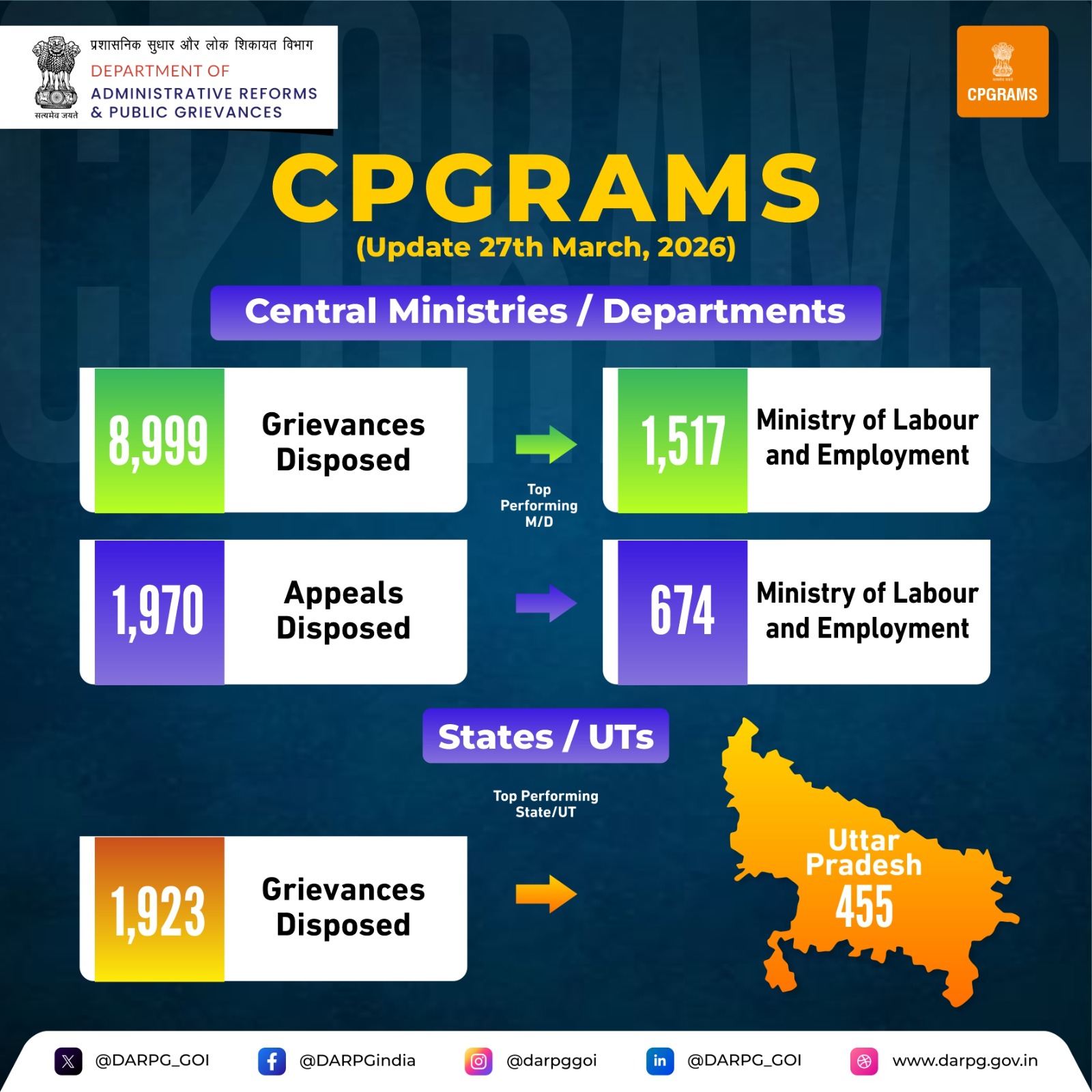 On 27th March, 2026, a total of 10,922 grievances were resolved across Central Ministries/Departments and States/UTs on the #CPGRAMS portal