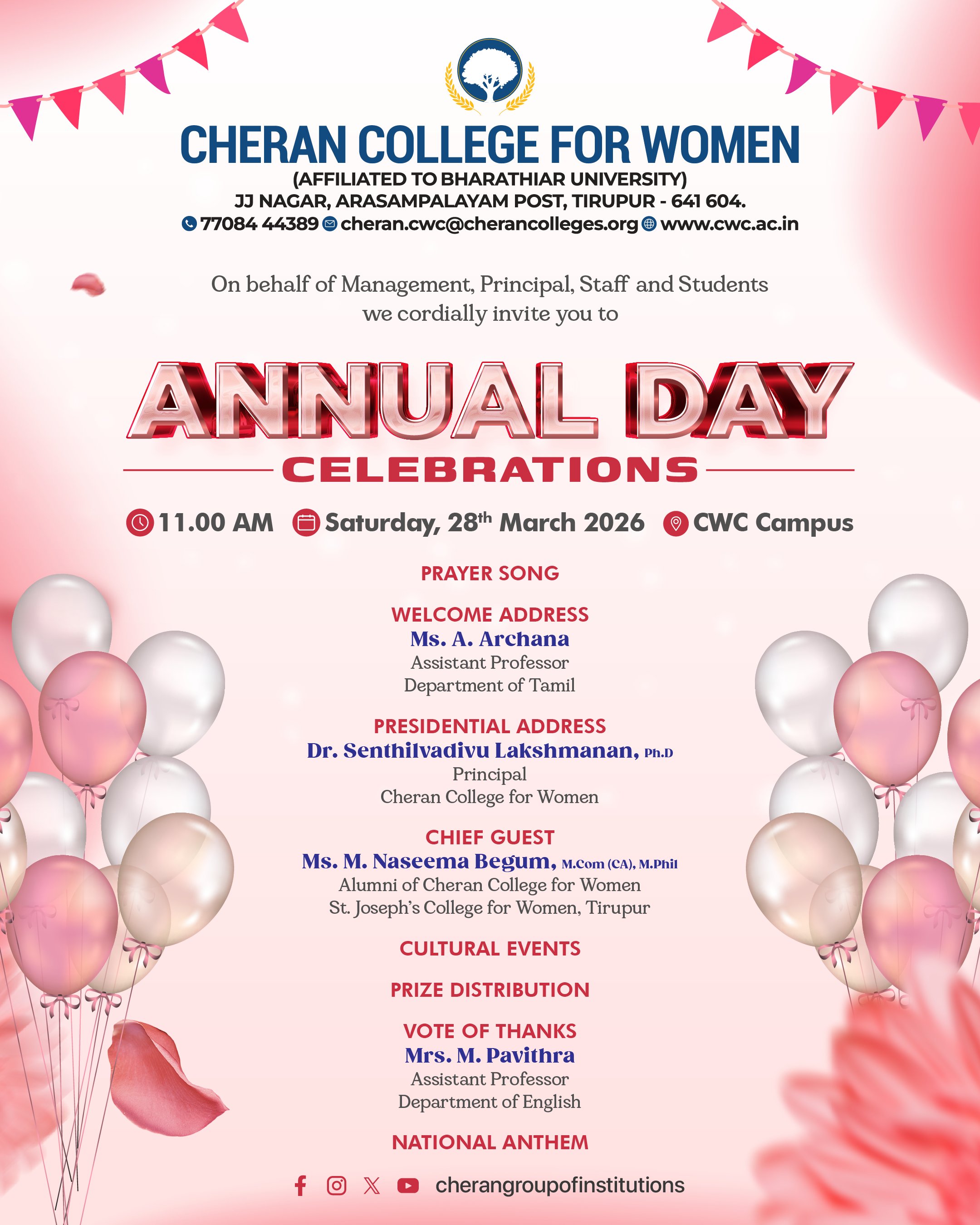 Cheran College for Women invites you to Annual Day on 28 Mar 2026, 11 AM at CWC Campus. Chief Guest: Ms. M. Naseema Begum (Alumna). Join us for cultural events & prize distribution celebrating student achievements. #AnnualDay #CWC #Tirupur #FuturewithCheran