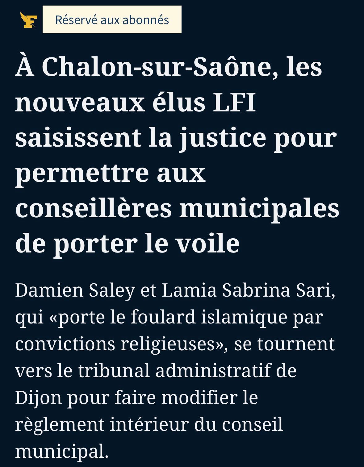 Pourquoi LFI conteste-t-elle le règlement du conseil municipal de la Ville de Chalon ? Sa requête au tribunal administratif ne le cache pas : « Madame Lamia Sabrina Sari (...) nouvellement élue (...) porte le foulard islamique par convictions religieuses. »