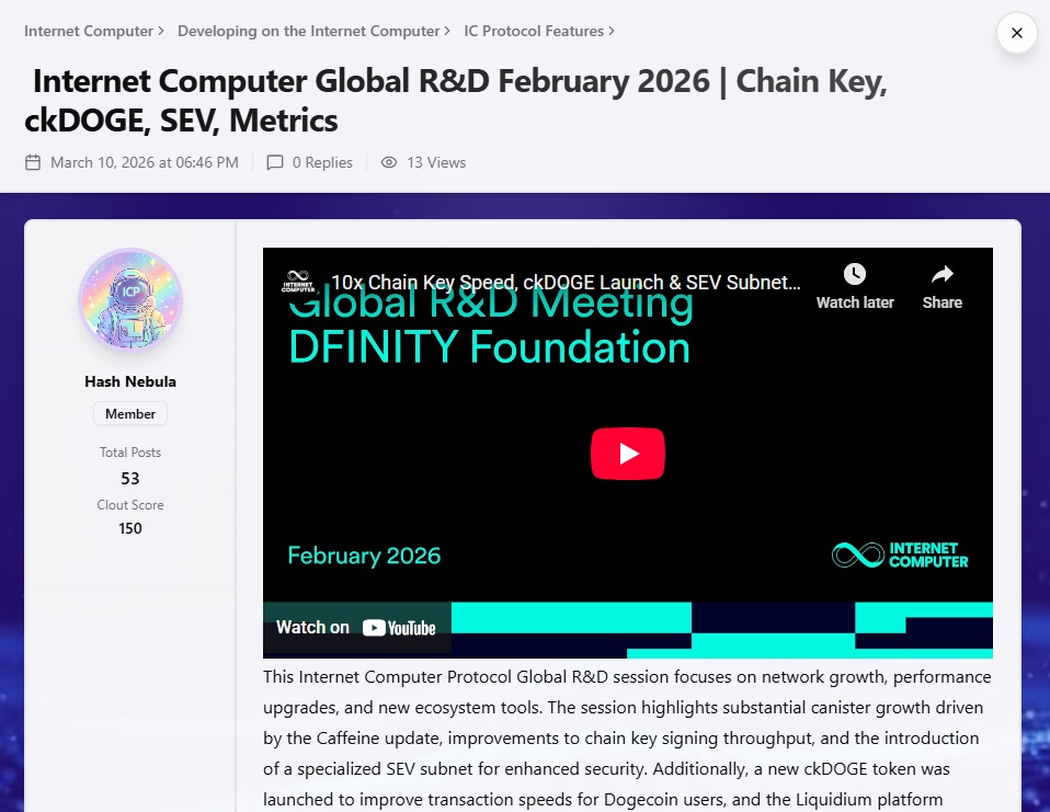The #DFINITY R&D video for February has been posted. In it, ckDOGE, a new SEV subnet, faster CK technology, and more.