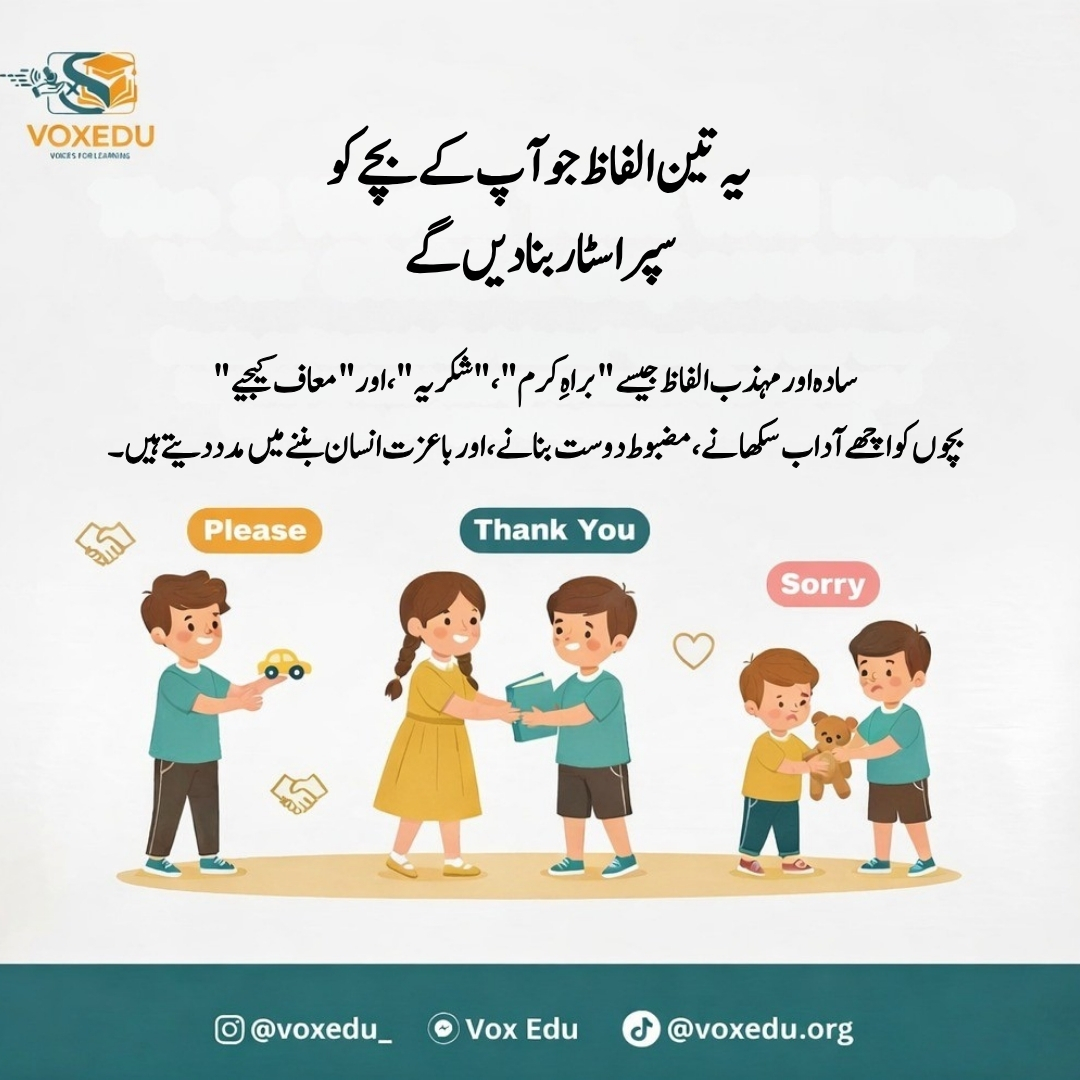 Bachon ko "Please," "Thank You," aur "Sorry" ka istemal sikhana unhein behtareen insaan banne mein madad deta hai. Aaiye ikhlaqiyat ko education ka lazmi hissa banayein.