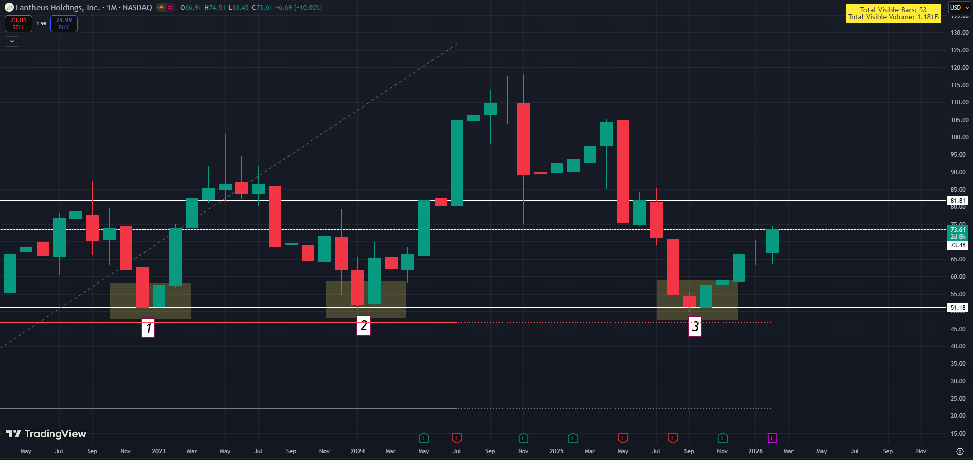 LNTH monthly chart showing three similar setups labeled 1, 2, and 3 over the past few years. Each time followed a period of consolidation and volatility before the next leg. Interesting structure — what do you see in this pattern?