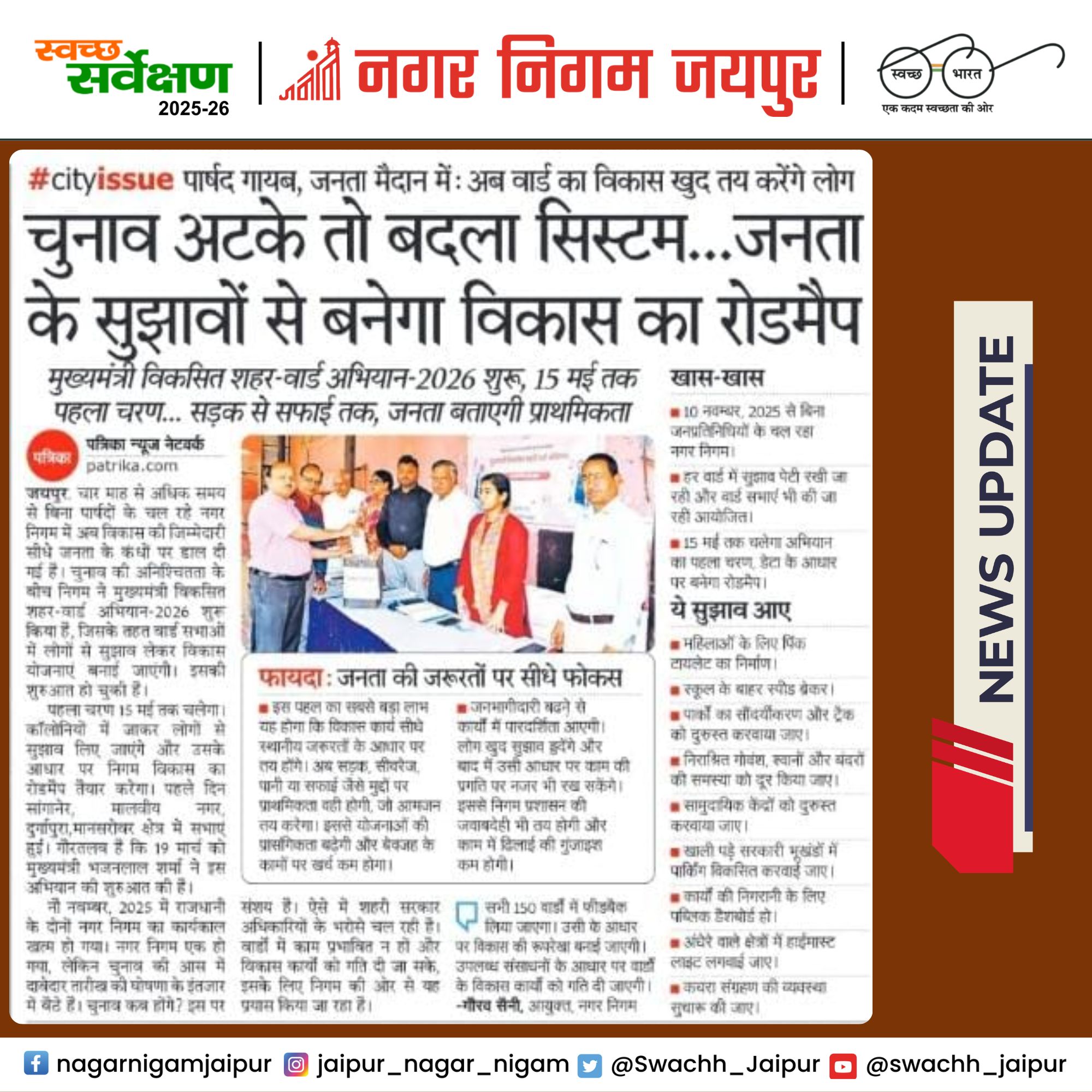 Nagar Nigam Jaipur @Swachh_Jaipur · 5d 📷 Jaipur News Update - मुख्यमंत्री विकसित शहर-वार्ड अभियान 2026 के तहत हर वार्ड में सुझाव लेकर विकास की प्राथमिकताएं तय की जा रही हैं, #JaipurNews #CityUpdate #JaipurDevelopment @RajCMO |@LSG_Rajasthan |@DcDmJaipur |@svoruganti1466r 31