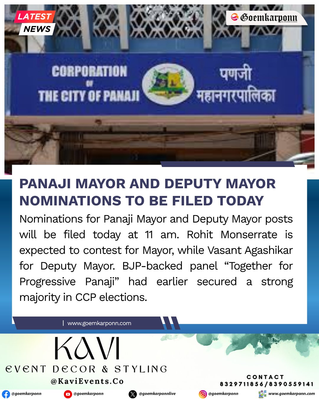 Goemkarponn @goemkarponnlive · 1d Panaji Mayor and Deputy Mayor Nominations to Be Filed Today #BreakingNews #GoaPolitics #CityUpdate #PanajiNews 28