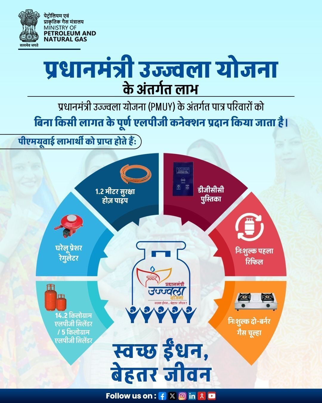 प्रधानमंत्री उज्ज्वला योजना (PMUY) देशभर में रसोईयों को बदल रही है। इसके अंतर्गत पात्र परिवारों को एलपीजी कनेक्शन, सिलेंडर, चूल्हा और पहला रिफिल पूरी तरह निःशुल्क प्रदान किया जाता है।
