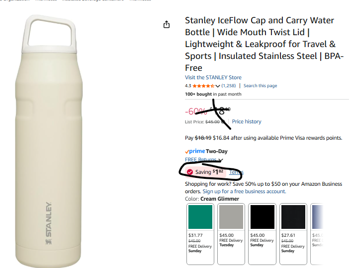 Brand4less @D26585421D · Jan 30 Lowest price ever. 64% off Amazon has the Stanley IceFlow Cap & Carry 36 oz Water Bottle on sale for $16.37 (was $45) amzn.to/4q9TO7A ad #AmazonDeal #Stanley #ClearanceFind 56