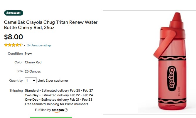 Brand4less @D26585421D · Feb 21 Crazy price drop Woot has the CamelBak Crayola Chug Tritan Renew Water Bottle (25oz, Cherry Red) on sale for $8. These usually go for $23+ elsewhere. Free shipping with Prime. mavely.app.link/WmPlj56tV0b #CamelBak #WaterBottle #ClearanceFind 65