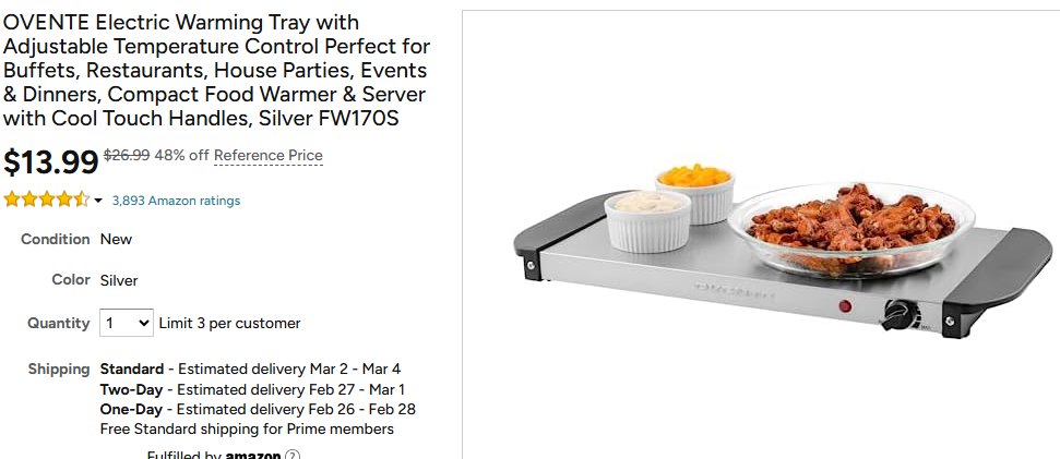 Brand4less @D26585421D · Feb 25 Hot kitchen deal Amazon has the OVENTE Electric Warming Tray FW170S on sale for $13.99 — that’s about 48% off its usual price. mavely.app.link/bC4PgTh020b #AmazonDeals #KitchenEssentials #ClearanceFind 28