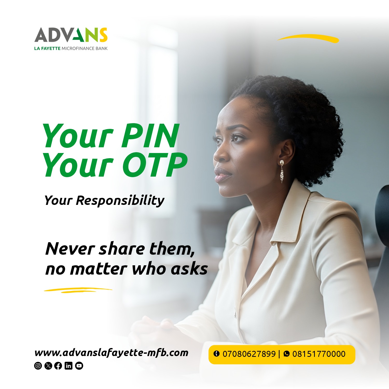 Advans will never ask for your PIN or OTP via social media, calls, or messages. Stay alert. Stay protected.