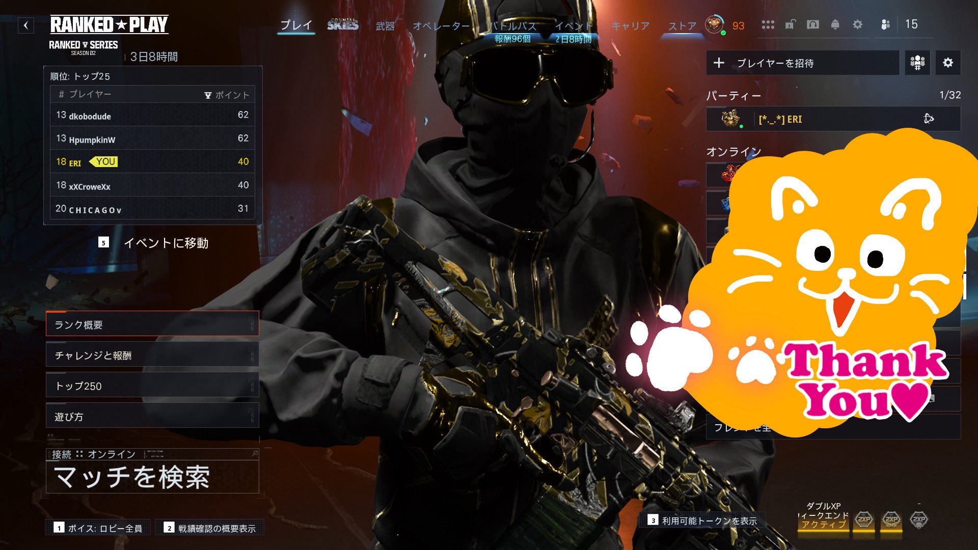 黒耀月下 @ReN_G3_ · 15m いつもパーティーを組んでくれてるメンバーの紹介&最近のクリップ🙌 TDMオンリーなので戦ったり、見かけた事があるフォロワーさんもいるかと🤔 大体、途中抜けされますが抜けずに戦ってくれると嬉しいです。 ※BGMついてるので音量注意 #BO7 #CoD #フォロtI 81
