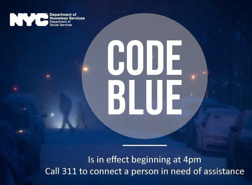 Temperatures will drop below freezing tonight and a #CodeBlue will be in effect. Should you see a homeless individual out in the cold, please call 311 and an outreach team will be dispatched to offer assistance.