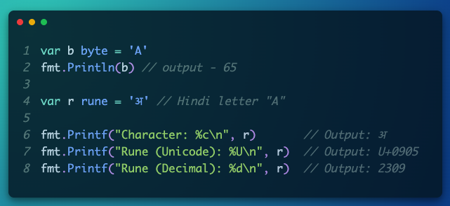 In Go byte and rune are aliases for numeric types that are commonly used when working with text and binary data.