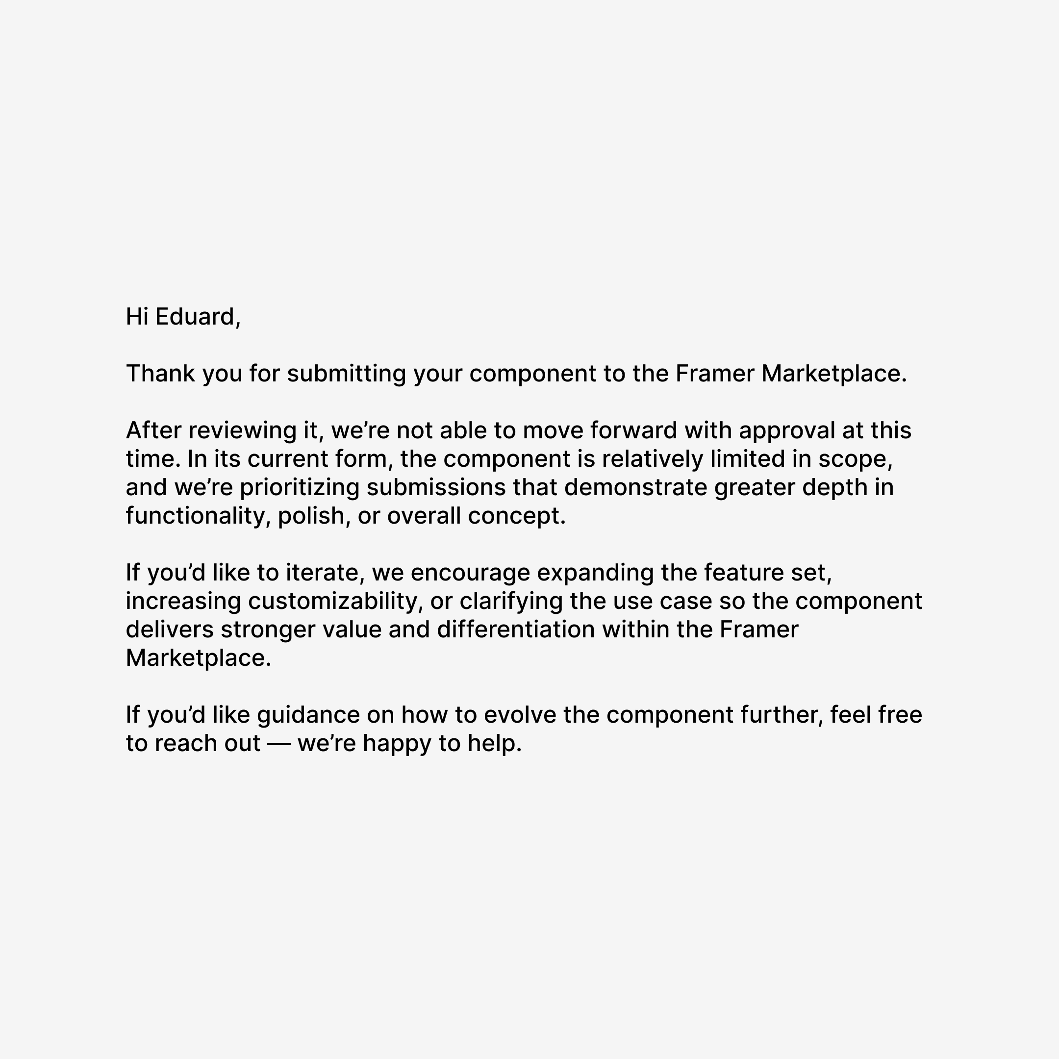 Got this rejection e-mail for my @framer component. Stings a little, can't lie about that. Fair feedback tho. Really wonder of how can I expand this component🤔 Just sent them an e-mail asking for guidance of how to expand it. I'm ready for some coding🔥 #framer #component #webdesgn #plugin #webdevelopment