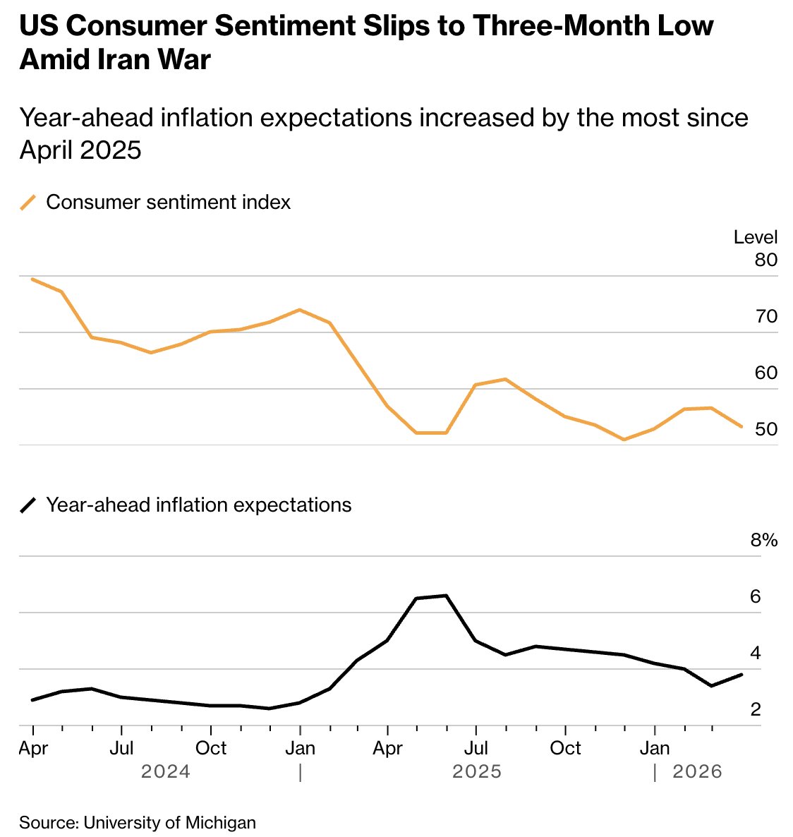 #consumer "US consumer sentiment slid to a 3month low in March and year-ahead inflation expectations jumped U. of Michigan’s final March sentiment index fell to 53.3 from a preliminary reading of 55.5 The survey period includes responses from Feb. 17 to March 23" -@business 1/