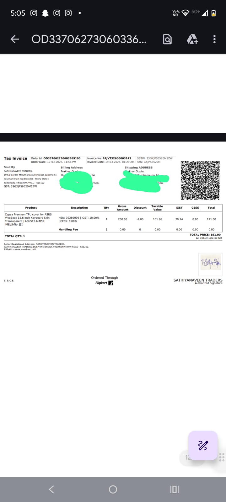 @Flipkart@flipkartsupport@jagograhakjago I paid 287, but invoice shows 191 product + rest as Gt charges.