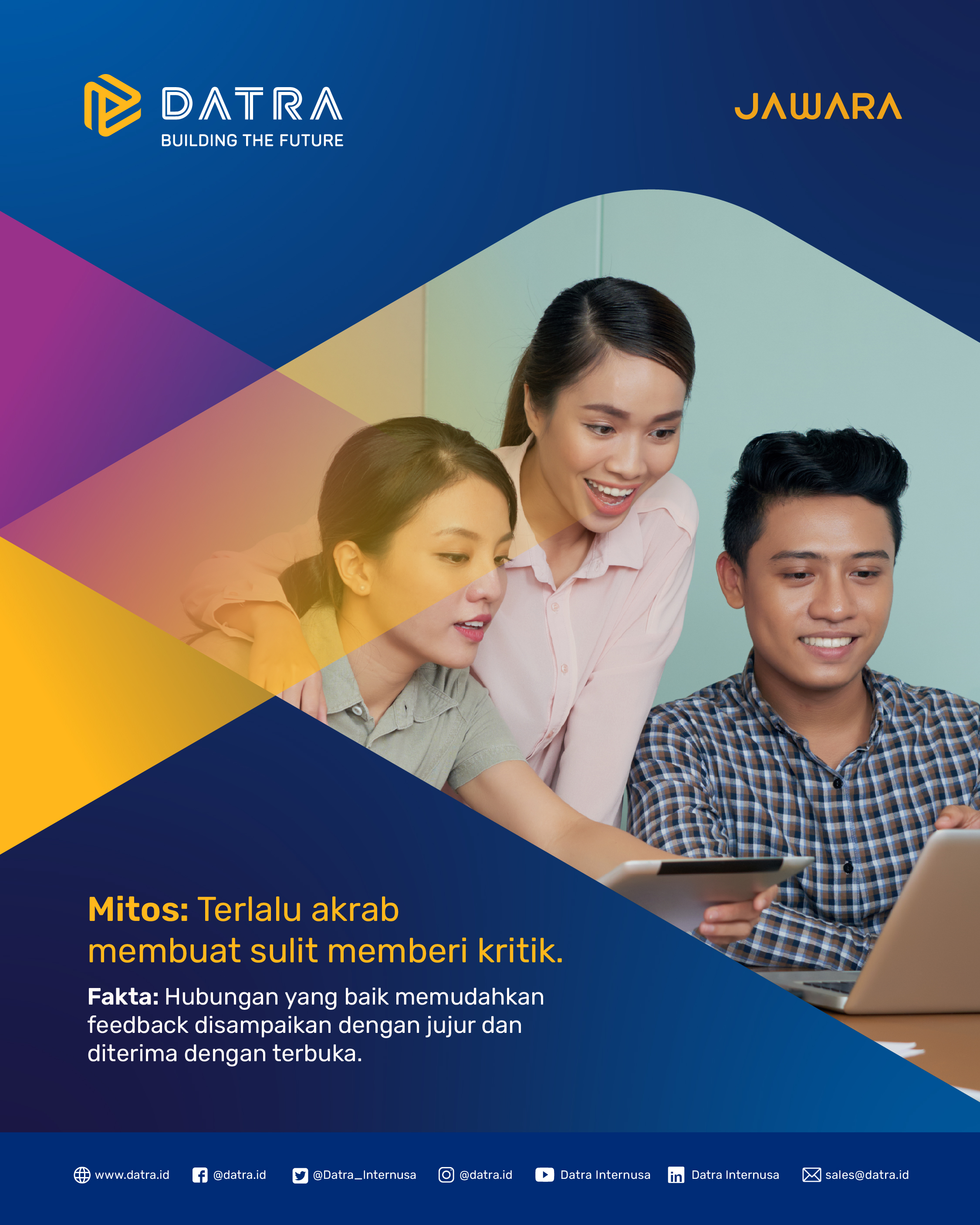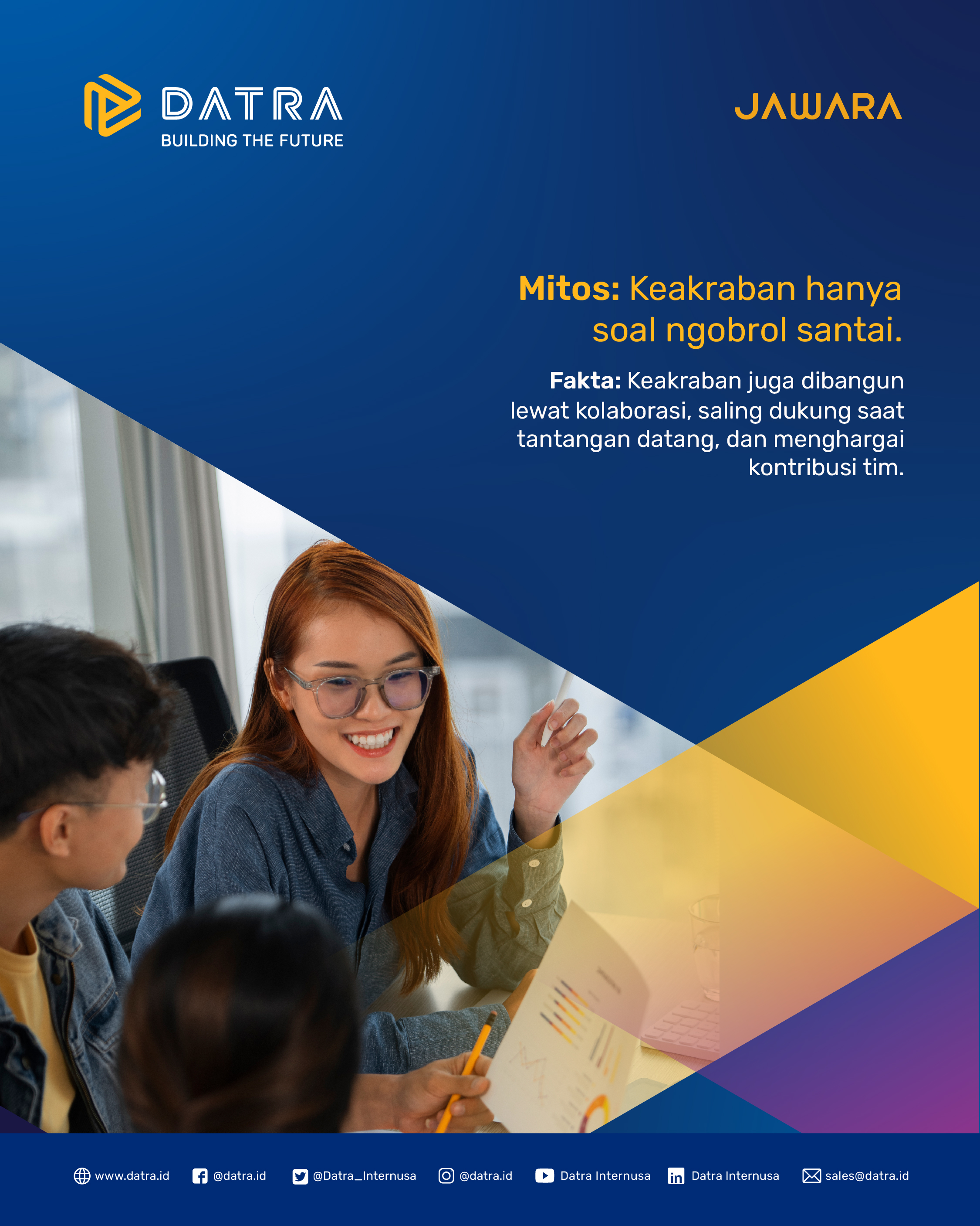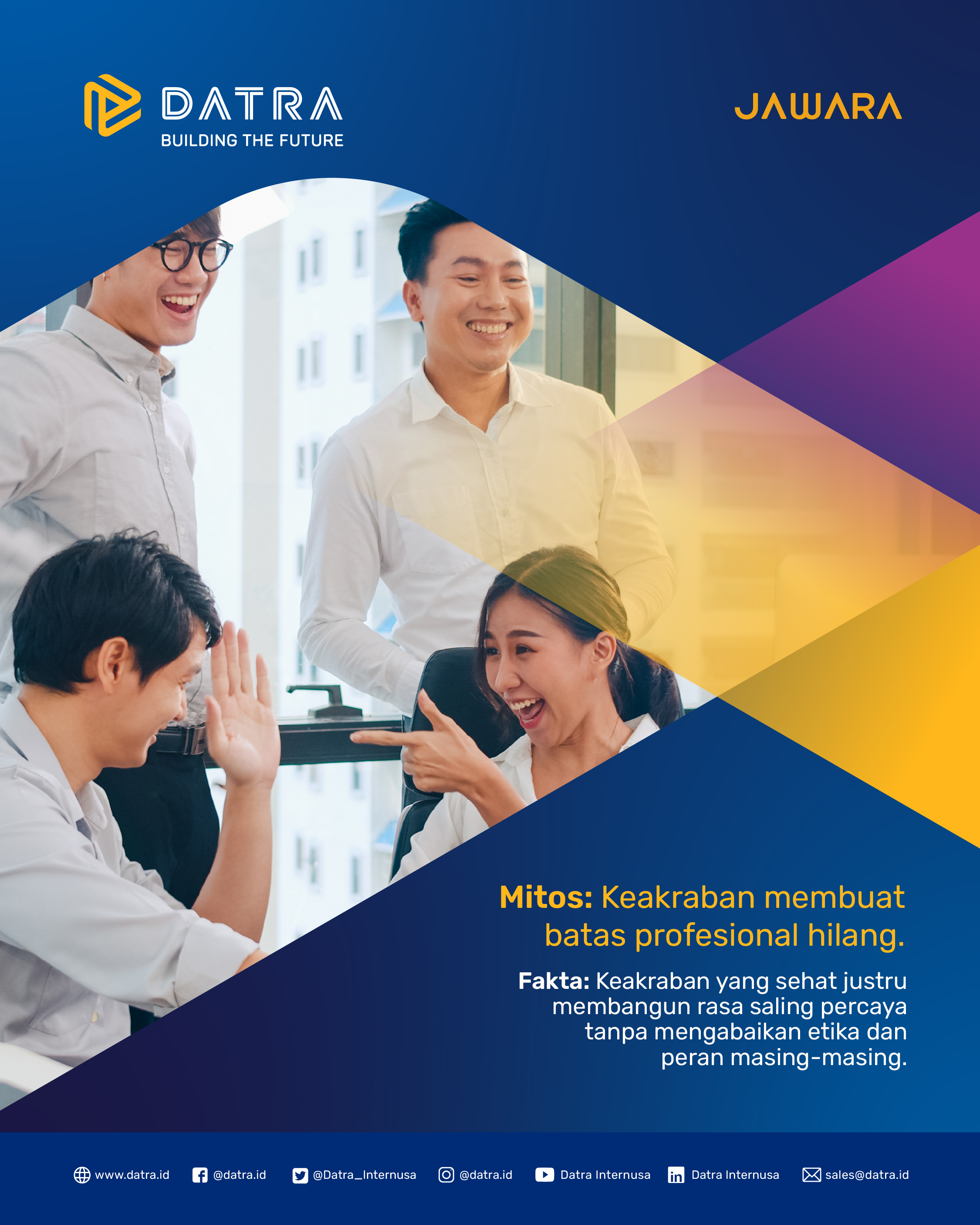 Keakraban di kantor bukan berarti menghapus batas profesional. Lewat hubungan yang sehat, tim justru bisa saling percaya, memberi masukan dengan terbuka, dan bekerja sama lebih solid. Karena AKRAB yang tepat = kolaborasi yang kuat. #datra #JAWARAAKRAB #corevalue