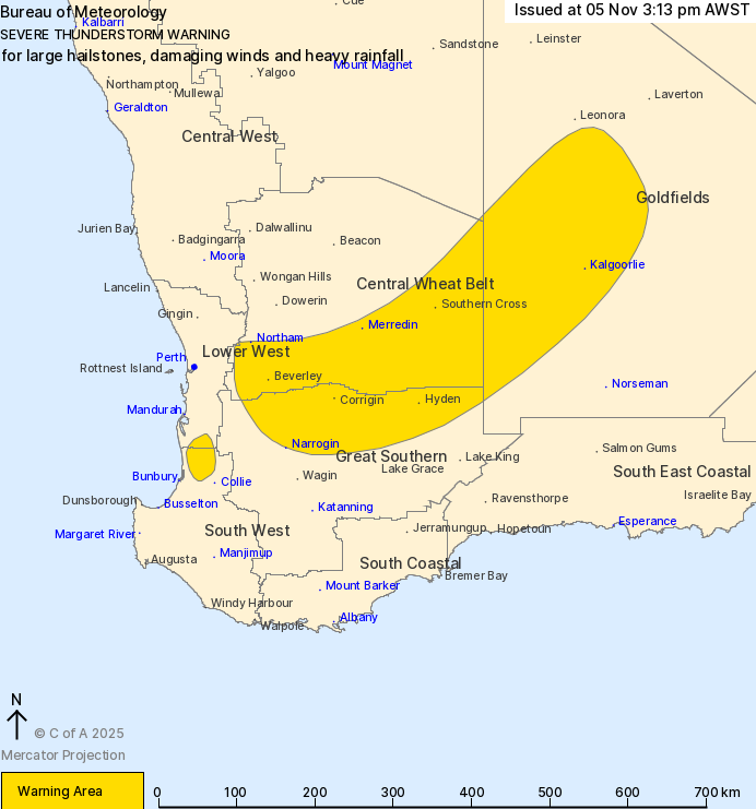 @BunburyWeather @coffeevanishere @perthovalman @speedbird020 @drstip @JayStill4 @baxlex @Sparrow_65 @ManjitK6987 @paulmp @ImTheOnlyAstro @MJG_1990 @Barnsy_Lisa @2017Ferret @ParmeliaWeather Updated Severe Thunderstorm Warning Now Include #Corrigin, #Hyden, #Kalgoorlie, #Merredin, #Northam And #SouthernCross ⛈️ The Warning For The Central West District Has Been CANCELLED 🚫 #Goldfields #SouthWestWA #Wheatbelt #WesternAustraliag