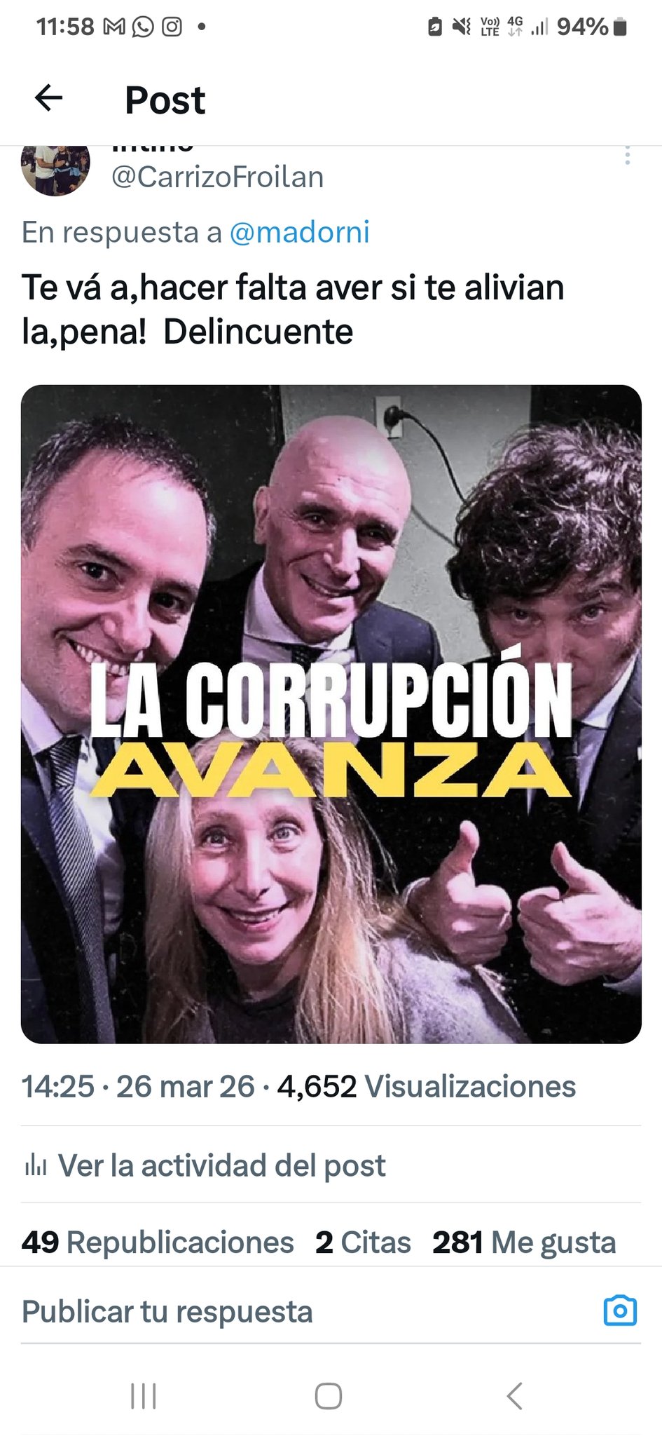 Intino @CarrizoFroilan · 12h Replying to @Pampa139 @Pampa139 Tobillera!!,Tobillera! TO BI LLE RA! URGENTE, antes que #ElDeslomado SE TOME UN VUELO PRIVADO Y SE FUGUE! @adorni #Corrupto SON UNA BANDA DE DELINCUENTES! 2 2 55