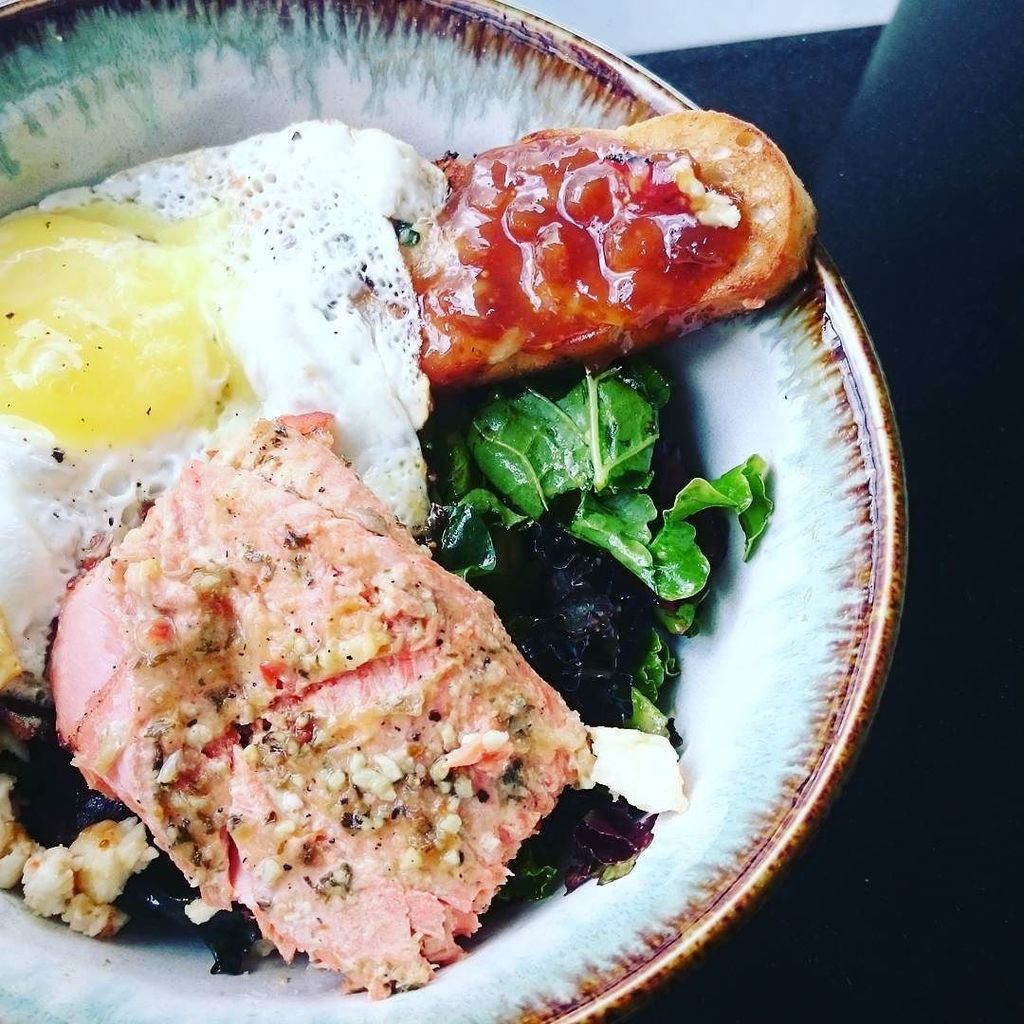 Citrus herb salmon, farm eggs, roasted garlic foccacia, fig jam, avocado, kale, mixed greens, crumbled feta. #homeoffice #lunch #creativele…