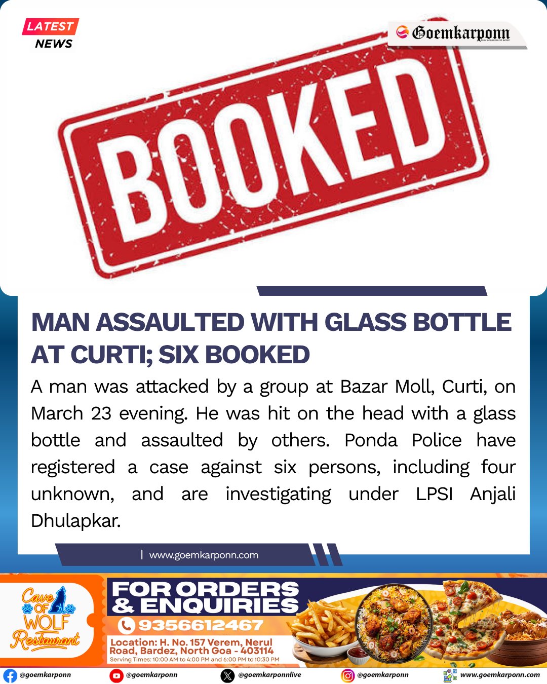 Goemkarponn @goemkarponnlive · 3d Man Assaulted With Glass Bottle At Curti; Six Booked #GoaNews #BreakingNews #Curti #Assault #PoliceUpdate #Ponda #GoaUpdates 12