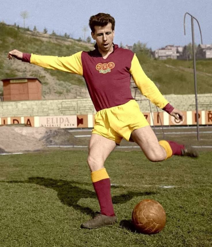 Josef Masopust; adorned in delicious #DuklaPraha 🤎💛 attire, pictured at the Stadion Juliska, #Praha, #Czechoslovakia 🇨🇿 shortly after leading #Nároďák to the 1962 #WorldCup Final 🇨🇱. His individual feats won Masopust the 1962 European Footballer of the Year avuTvzD