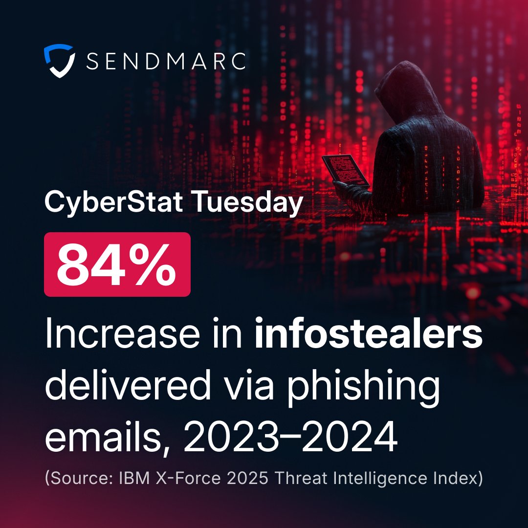 Infostealers delivered via phishing surged 𝟴𝟰% 𝗴𝗹𝗼𝗯𝗮𝗹𝗹𝘆 𝗶𝗻 𝟮𝟬𝟮𝟯–𝟮𝟬𝟮𝟰, rising 𝟭𝟴𝟬% by early 2025. DMARC blocks fraudulent emails before they reach inboxes. Book a demo to see if your enterprise is vulnerable: eu1.hubs.ly/H0sV8GG0