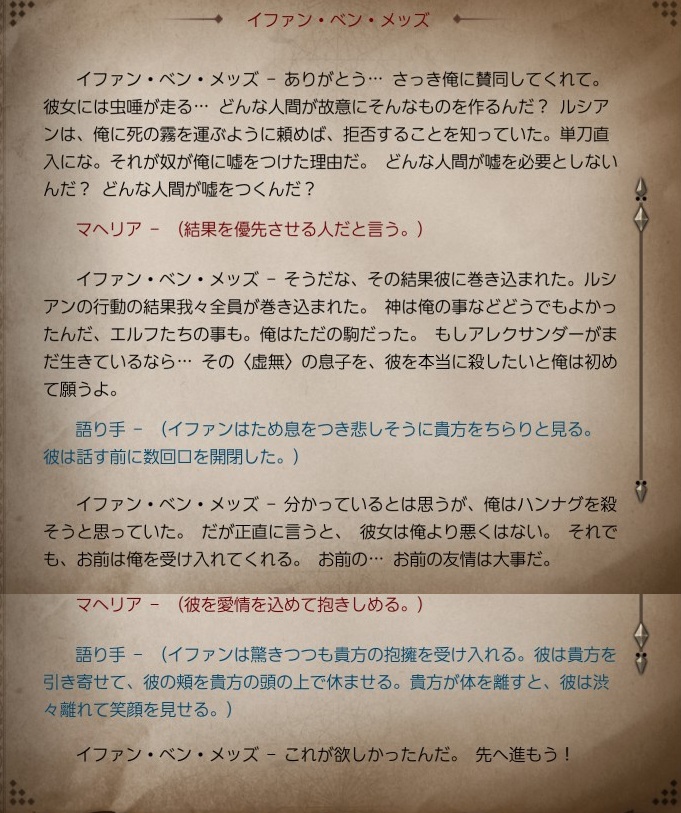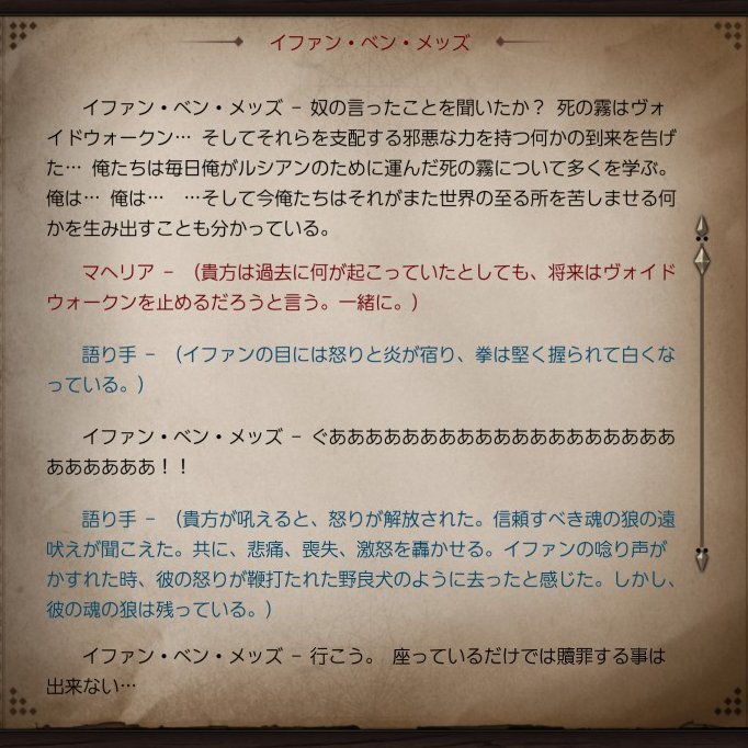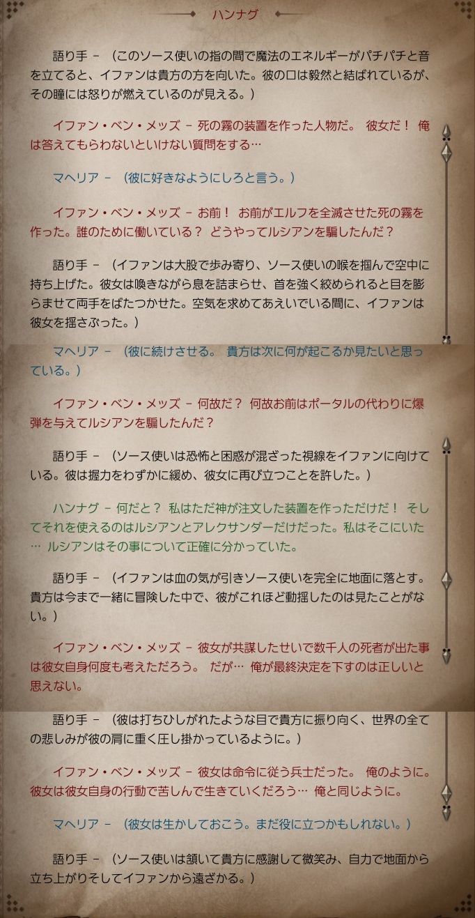 おふ @mofugashi6262 · Mar 19 今日の2周目ディヴィニティ及びDivinity Original Sin2 4章 イファン、物語の根幹にガッツリ絡んでるからかオリジンの中でもめっちゃ会話多い様に感じる ハンナグ救出後の会話 #DOS2 1 2 170