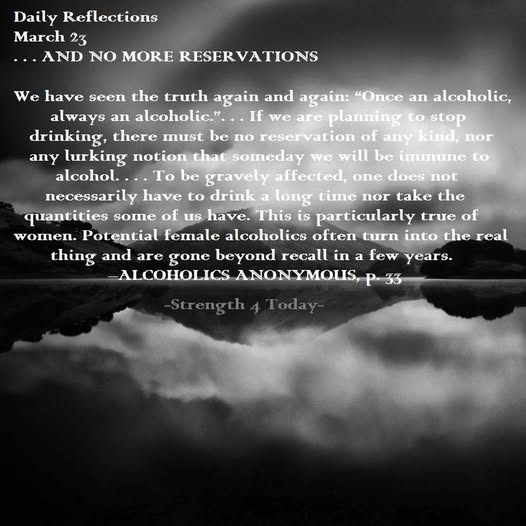 We have seen the truth again and again: “Once an alcoholic, always an alcoholic.”. . . If we are planning to stop drinking, there must be no reservation of any kind...
