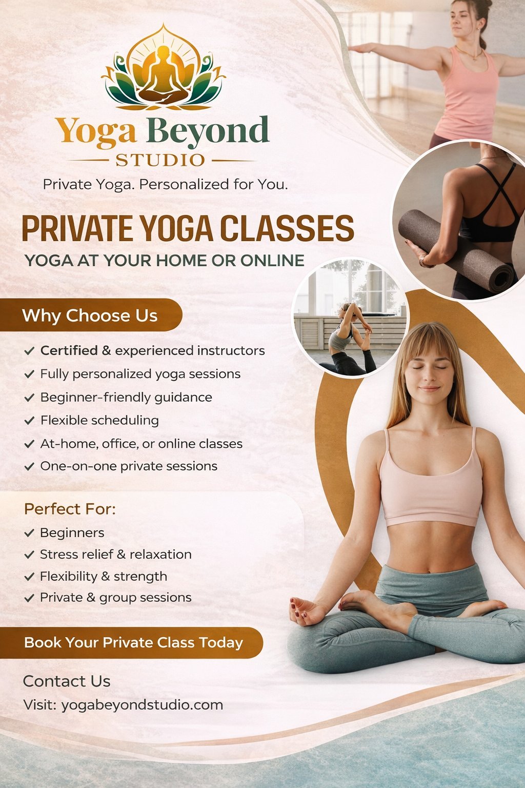 With Yoga Beyond Studio, enjoy private sessions at your home or online — flexible, personalized, and beginner-friendly.