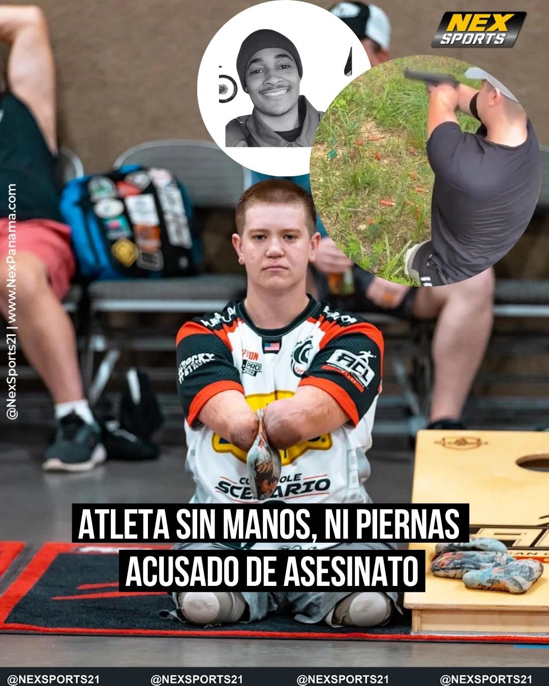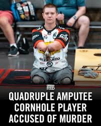 NEW: Quadruple amputee professional cornhole player accused of murdering someone before driving off in his Tesla.