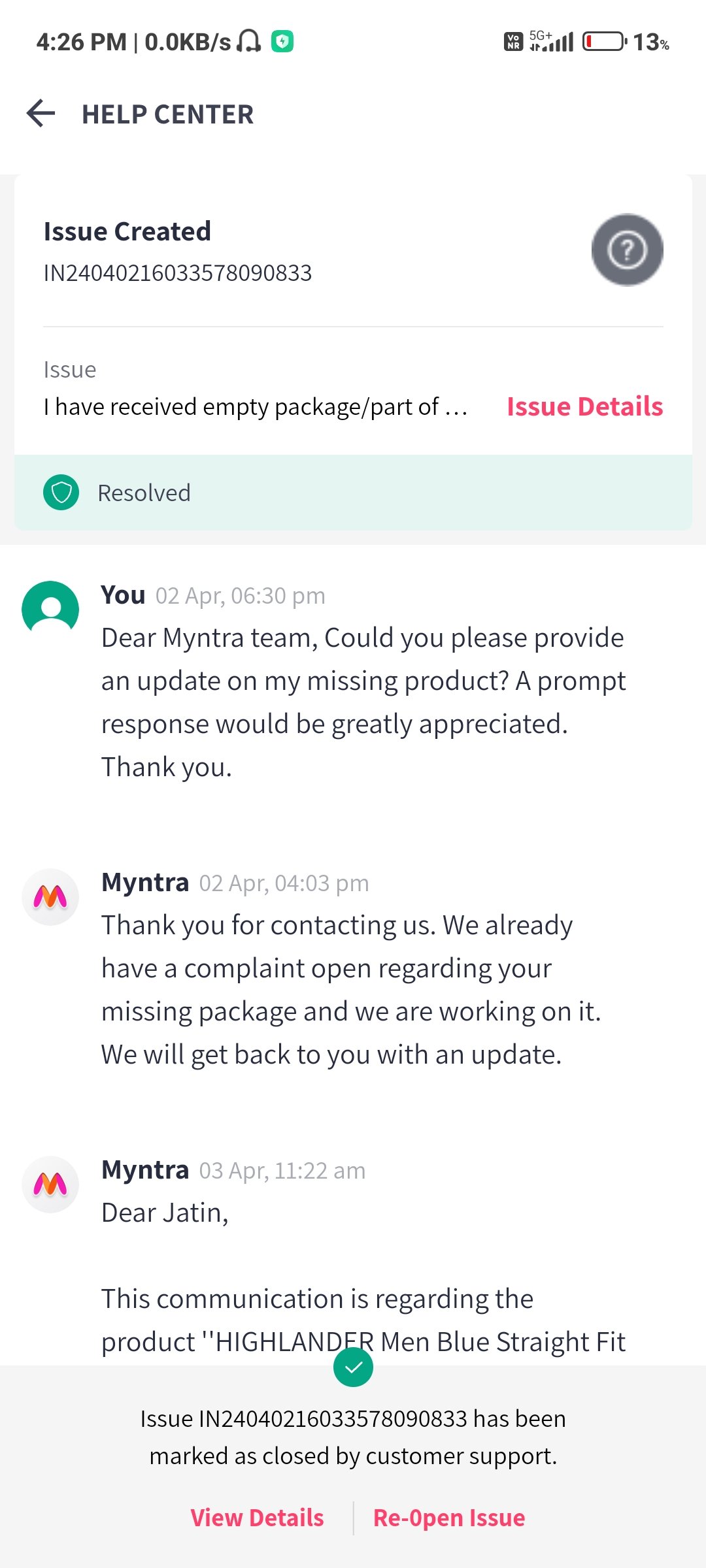 Ordered two jeans from @Myntra on 30th March, got only one on 2nd April. Is this a Myntra scam? Reached out to customer service, but they keep delaying the resolution. Frustrated beyond words! 😡 #MyntraScam #DelayedResolution@myntraW