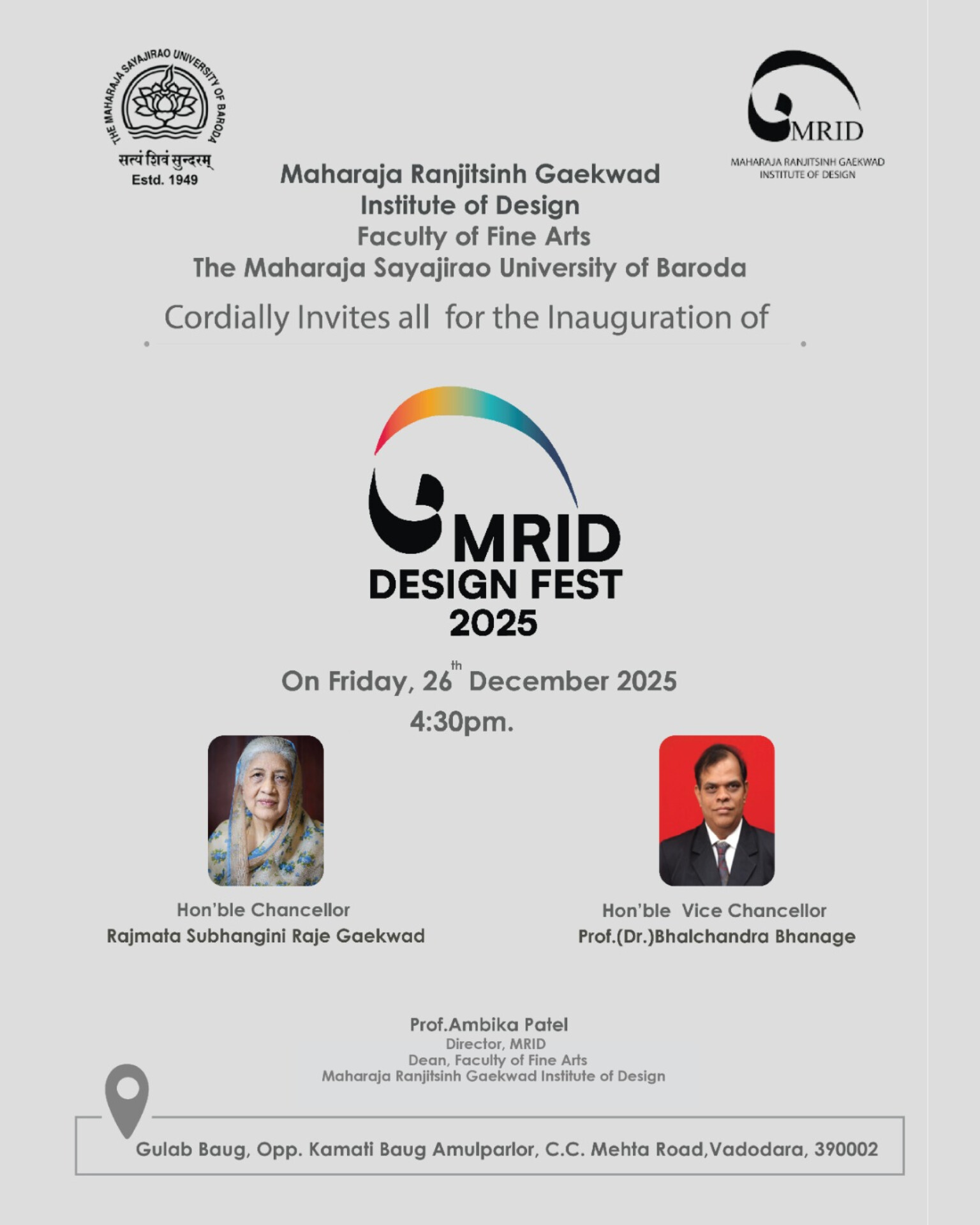 MRID, Faculty of Fine Arts, The MSUB invites you to the Inauguration of MRID Design Fest 2025, celebrating creativity and design excellence.