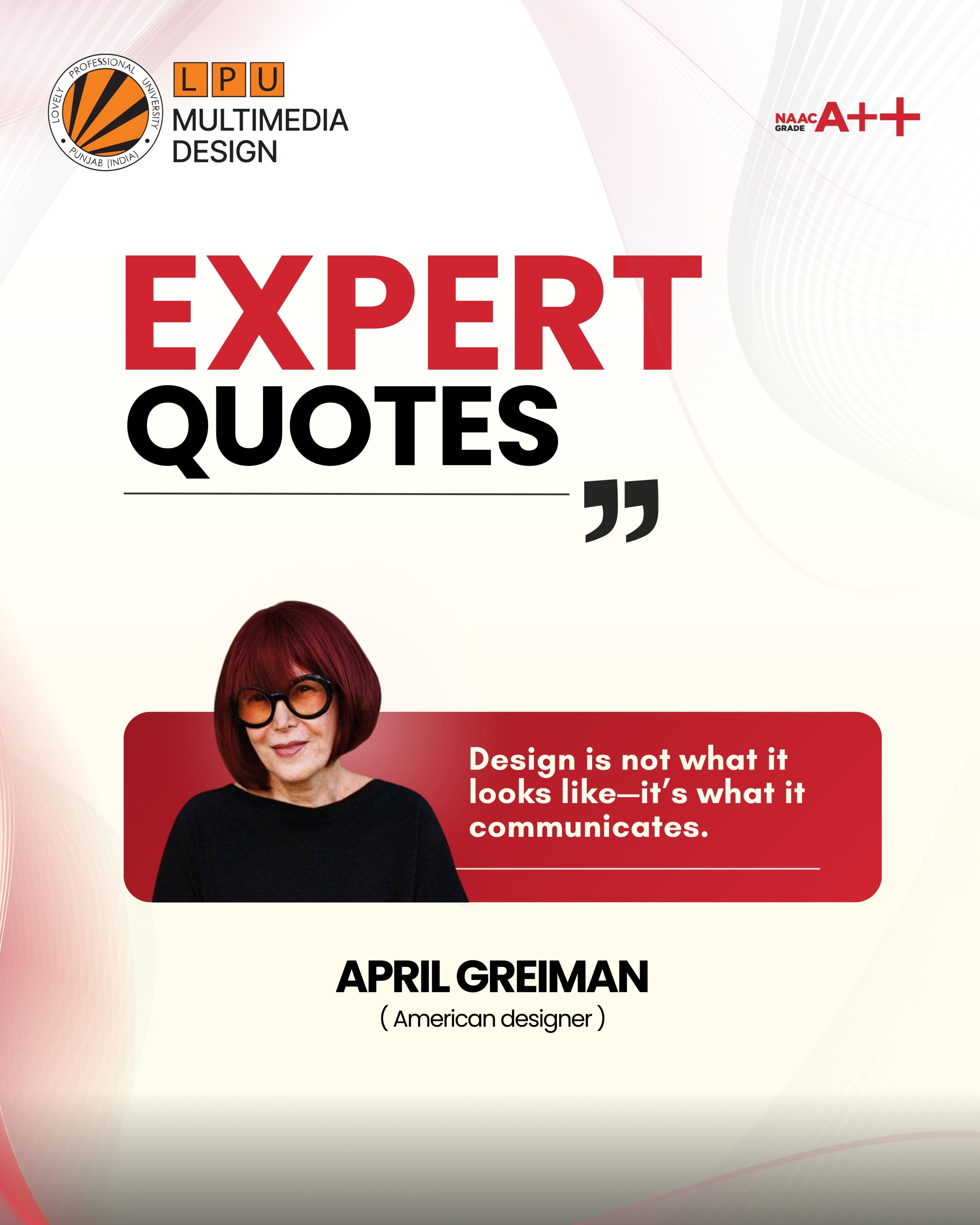 An inspiring expert quote by April Greiman, reminding us that meaningful design goes beyond aesthetics and speaks with purpose. A timeless lesson for every creative mind.
