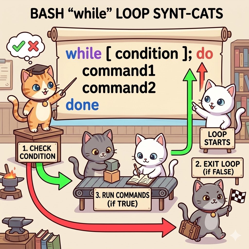 Master the Bash 'while' loop with this cute, visual guide! Check conditions and keep commands running while they're true. 🐱�� #BashScripting #DevLife #CatsWhoCodNy