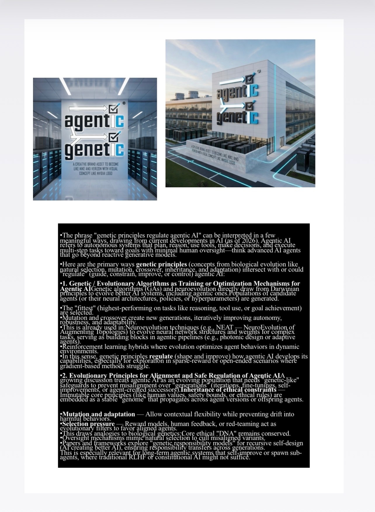 Here are ways genetic principles (concepts from biological evolution like natural selection, mutation, crossover, inheritance, and adaptation) intersect with or could "regulate" (guide, constrain, improve, or control) agentic AI:1. Genetic / Evolutionary Algorithms as Training or Optimization Mechanisms for Agentic AIGenetic algorithms (GAs) and neuroevolution directly draw from Darwinian principles to evolve better AI systems, including agentic ones.Populations of candidate agents (or their neural architectures, policies, or hyperparameters) are generated.