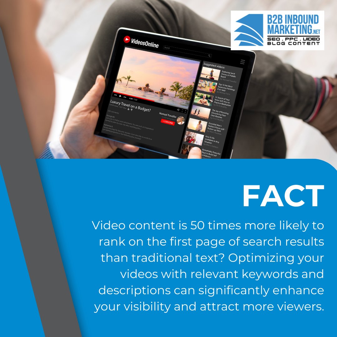 Video content is 50 times more likely to rank on the first page of search results than traditional text? Optimizing your videos with relevant keywords & descriptions can significantly enhance your visibility & attract more viewers.