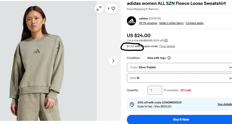 The adidas store on eBay has the adidas Women’s ALL SZN Fleece Loose Sweatshirt for $11.52, was $55.