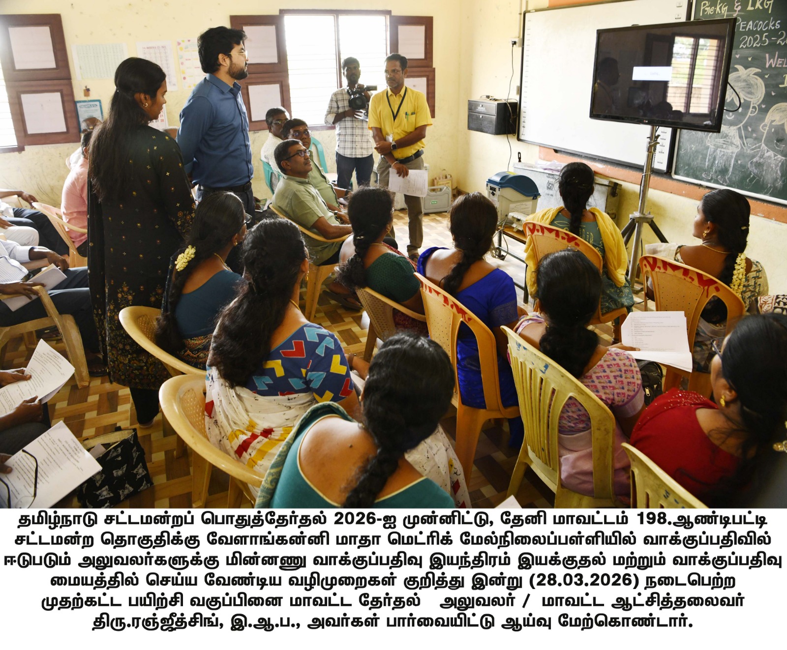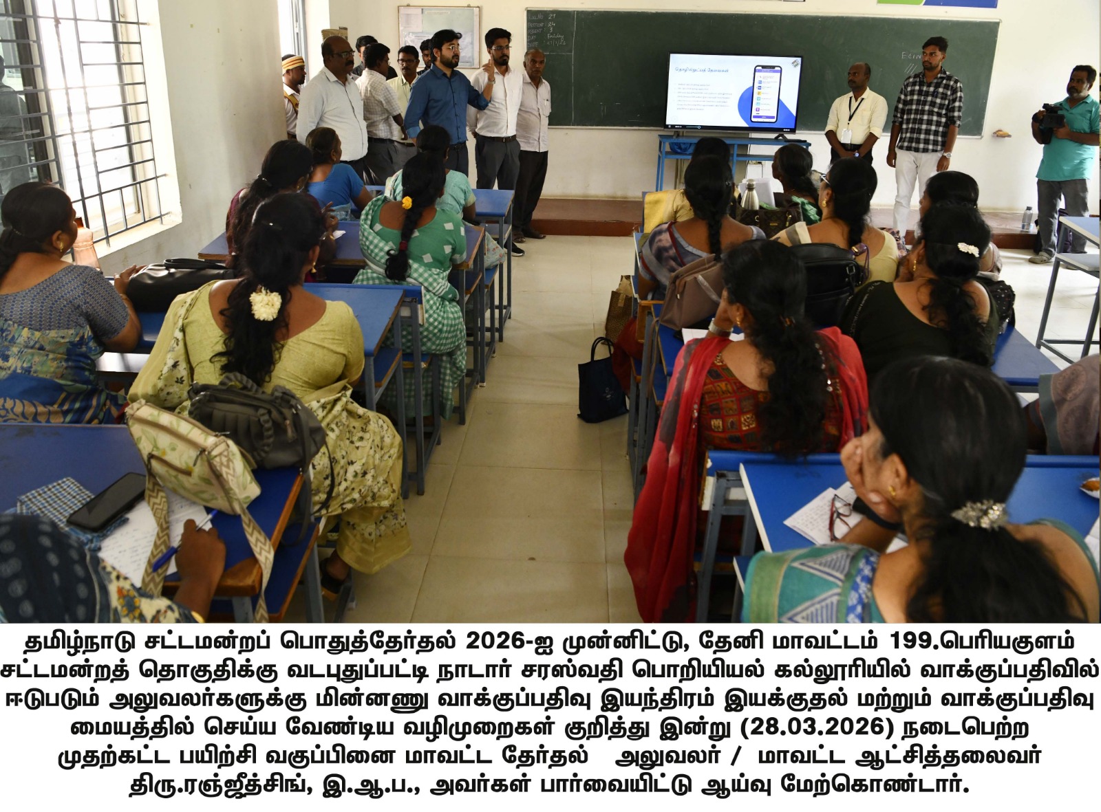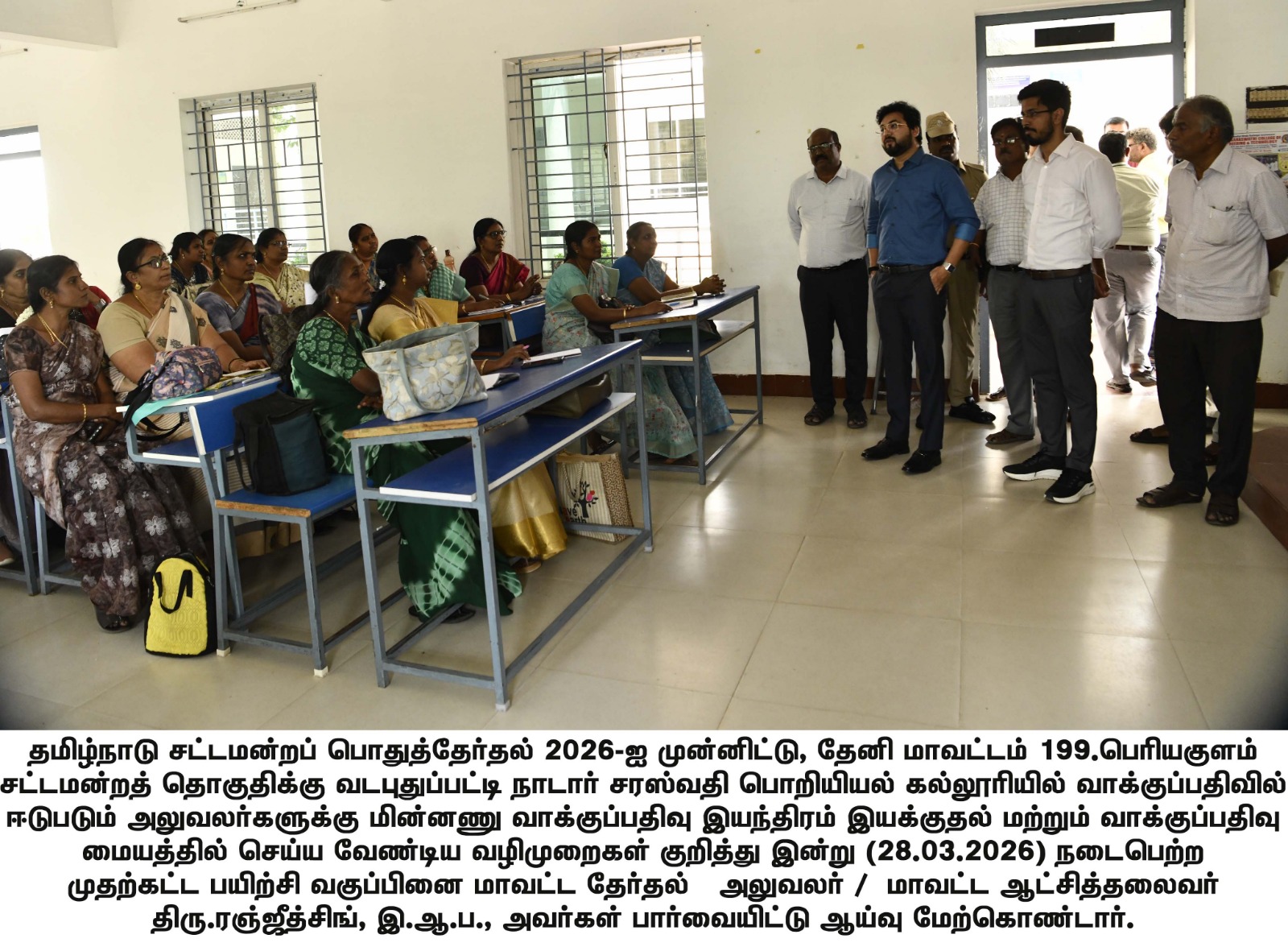 தூய நெஞ்சக் கல்லூரியில், தலைமை வாக்குச்சாவடி (PRESIDING OFFCER'S PO, PO1, PO2, PO3) அலுவலர்கள் தேர்தல் நாளில் பணிபுரிவதற்கான முதற்கட்ட பயிற்சி வகுப்பு நடைபெற்று வருவதை மாவட்ட தேர்தல் அலுவலர் 28.03.2026 - பார்வையிட்டார்.