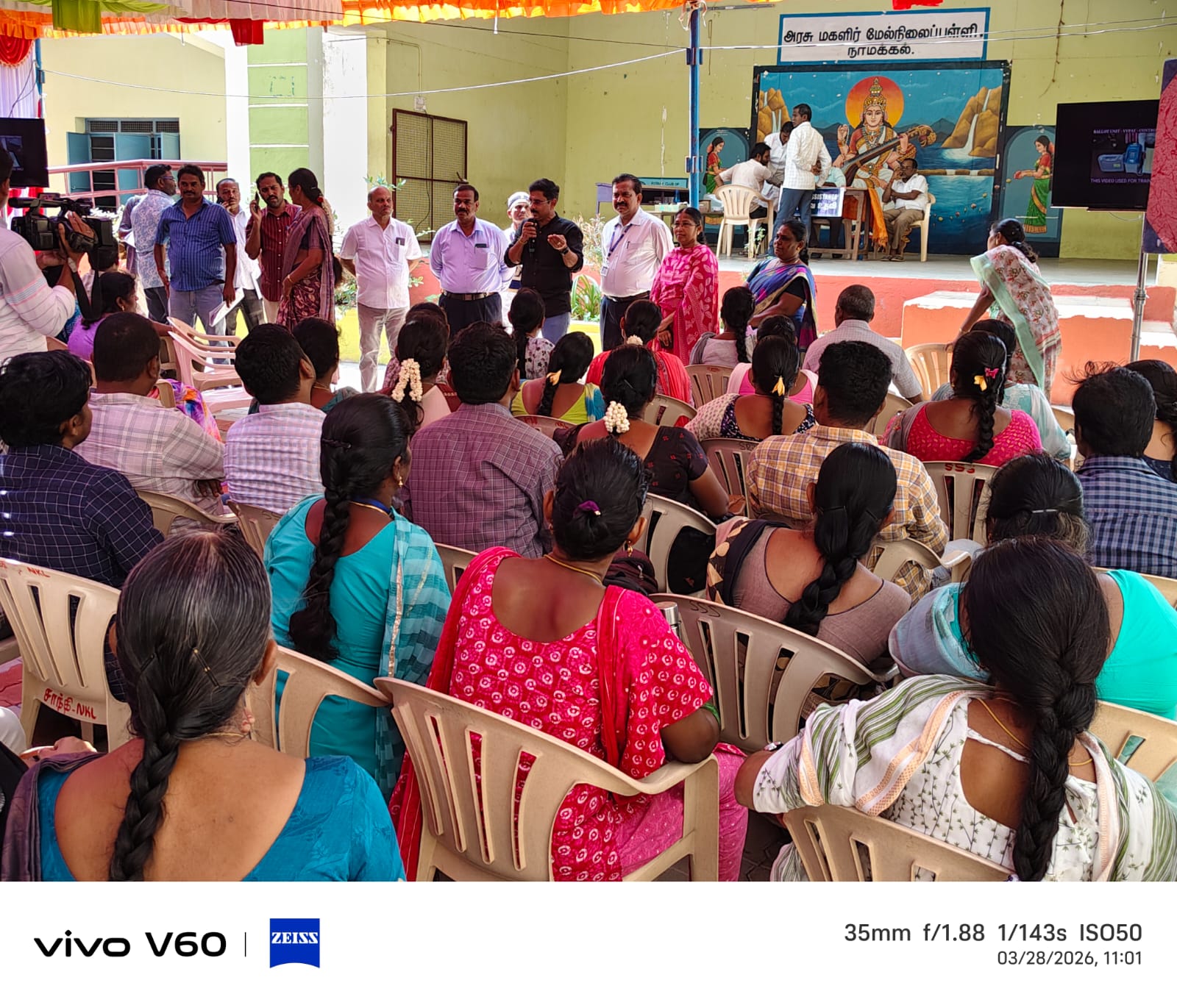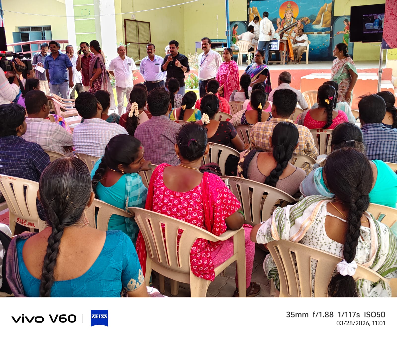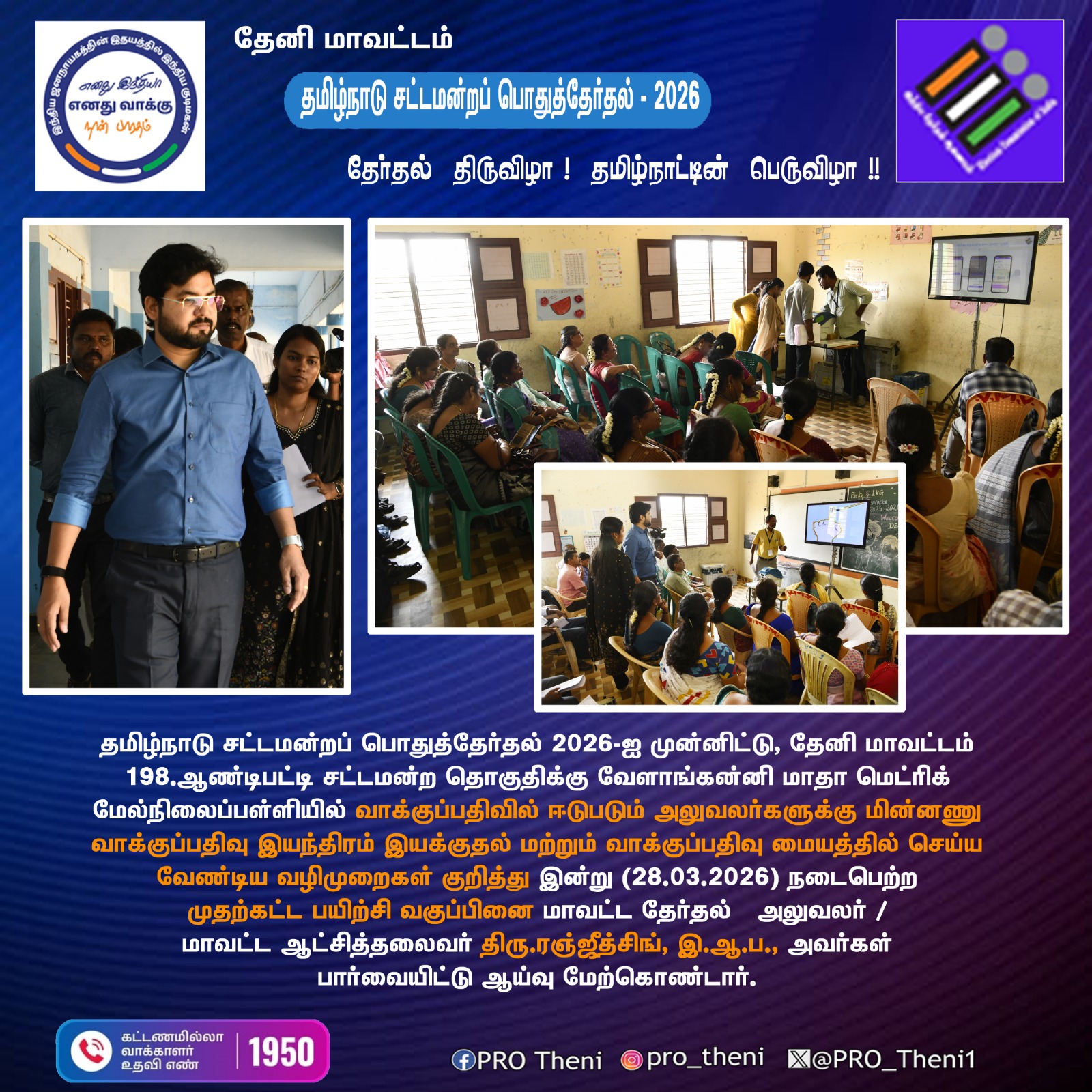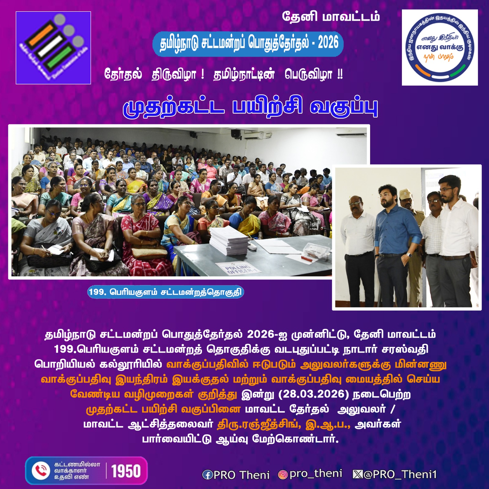 தூய நெஞ்சக் கல்லூரியில், தலைமை வாக்குச்சாவடி (PRESIDING OFFCER'S PO, PO1, PO2, PO3) அலுவலர்கள் தேர்தல் நாளில் பணிபுரிவதற்கான முதற்கட்ட பயிற்சி வகுப்பு நடைபெற்று வருவதை மாவட்ட தேர்தல் அலுவலர் 28.03.2026 - பார்வையிட்டார்.